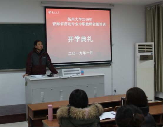 1月11日上午,2019年青海省职业院校药剂专业教师培训班在我院开学。在开班仪式上院继续教育办公室主任张跃转达了学院党委徐蕾书记对来参加学习学员的问候和欢迎,同时介绍了扬州大学、扬州大学医学院的有关情况,并就本次培训的总体安排、具体要求、预期目标作了总体说明和部署,对参训学员提出了具体要求。他要求学员在后面的培训中,刻苦努力、认真学习;加强交流、相互补短;遵守纪律,确保安全。参加本次培训的10名药剂专业教师参加了开班。开班仪式后即开始了第一讲“教师职业道德及教师礼仪”专题讲座。