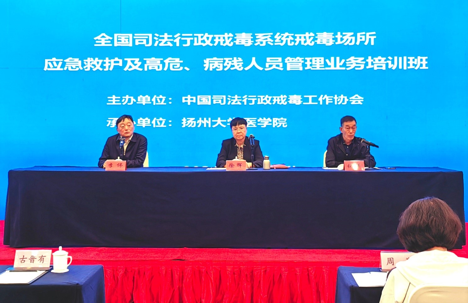 4月22日上午,全国司法行政戒毒系统戒毒场所应急救护及高危、病残人员管理业务培训班在扬州举行。中国司法行政戒毒工作协会党组副书记、副会长徐辉同志,中国司法行政戒毒工作协会原副会长张祥同志,扬州大学医学院副院长李伟同志等领导出席开班活动。会议由本次培训班中国司法行政戒毒工作协会驻培训基地领导张祥同志主持,来自全国25个省、市、自治区戒毒系统108名戒毒人民警察参加开班活动。