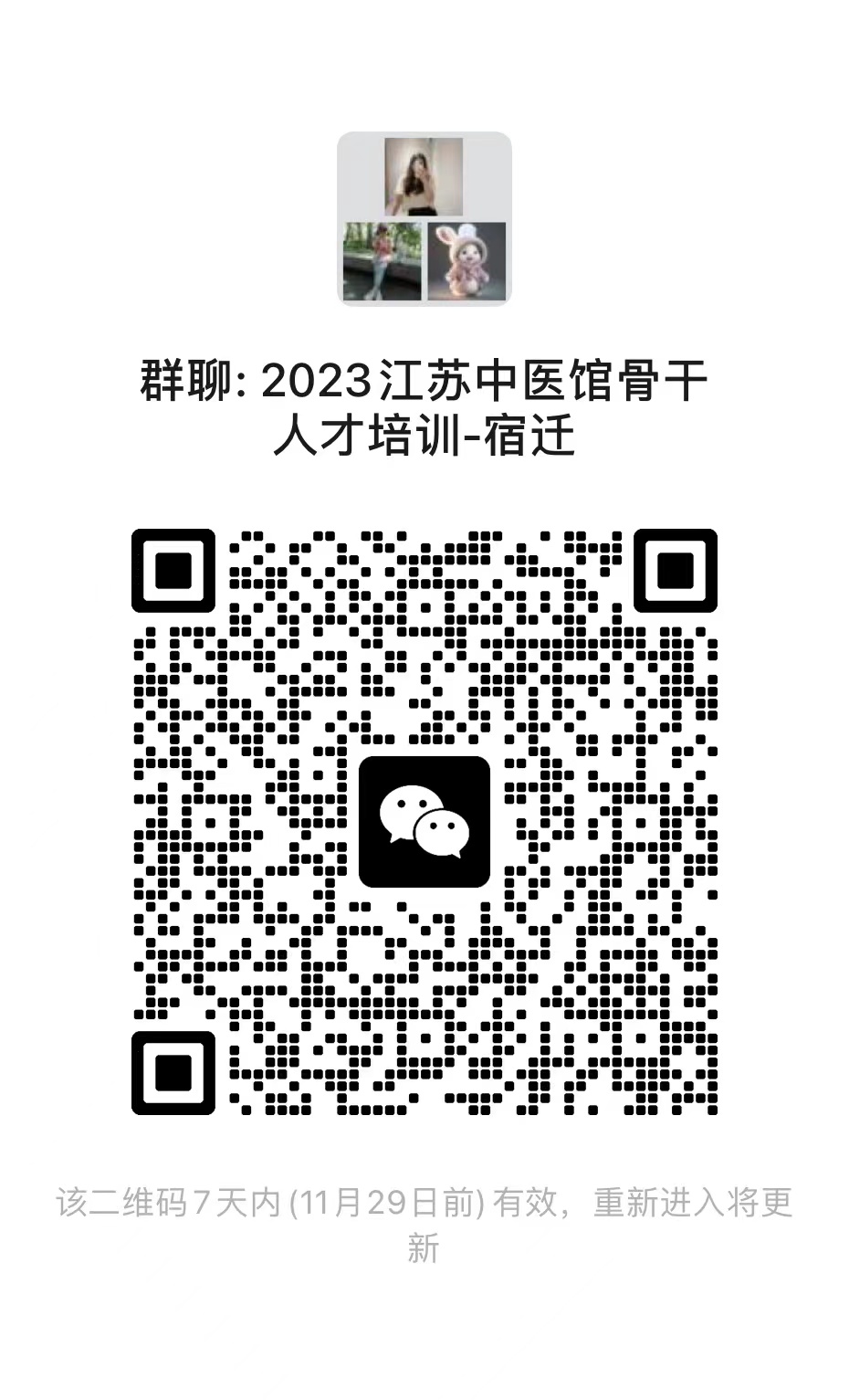 根据江苏省中医药管理局《关于启动 2023 年江苏省中医馆骨干人才培训项目的通知》(苏中医科教函〔2023〕6 号)、《关于增补 2023 年江苏省中医馆骨干人才培训项目名额的通知》(苏中医科教函〔2023〕42号)精神,江苏省2023年中医馆骨干人才培训线上授课开始授课。请扫描下方二维码加入班群,如有特殊情况,可拨打办公室电话(0514-87978814),谢谢。