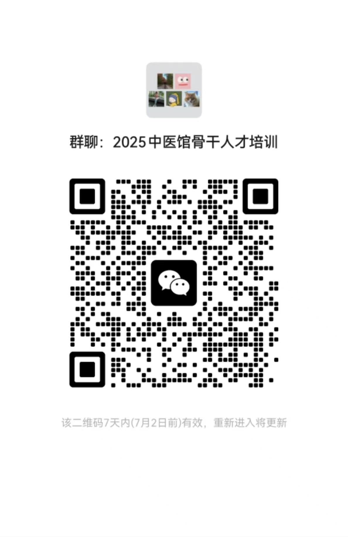 根据江苏省中医药管理局《关于启动 2025 年江苏省中医馆骨干人才培训项目的通知》(苏中医科教函〔2025〕2 号)精神,江苏省2025年中医馆骨干人才培训线上授课即将开始。请尽快扫描下方二维码加入班群,如有特殊情况,可拨打办公室电话(0514-87978814),谢谢