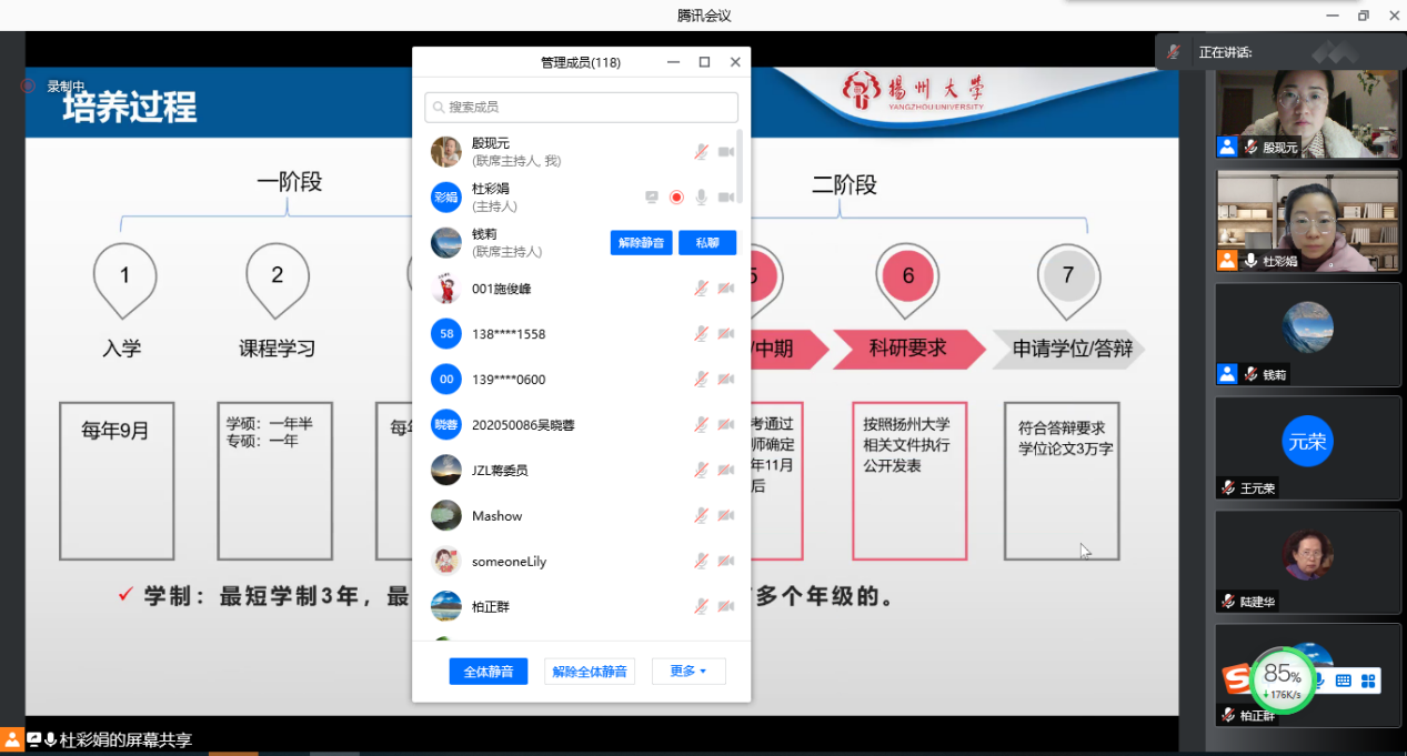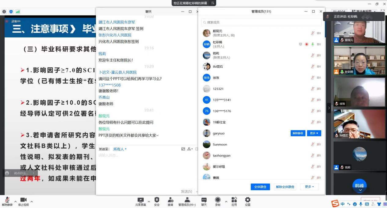 为进一步加强同等学力硕士研究生的培养质量和管理水平,促进学科内涵建设和办学水平的提高,我院分别于11月25日、11月28日晚19:00,召开两场校外硕士研究生导师线上培训会。会议由医学院钱莉副院长主持,研究生教学与管理办公室殷现元副主任、陈趣老师、杜彩娟老师就研究生培养环节分别做了相应的解读,共计260余名硕士研究生导师参加会议。