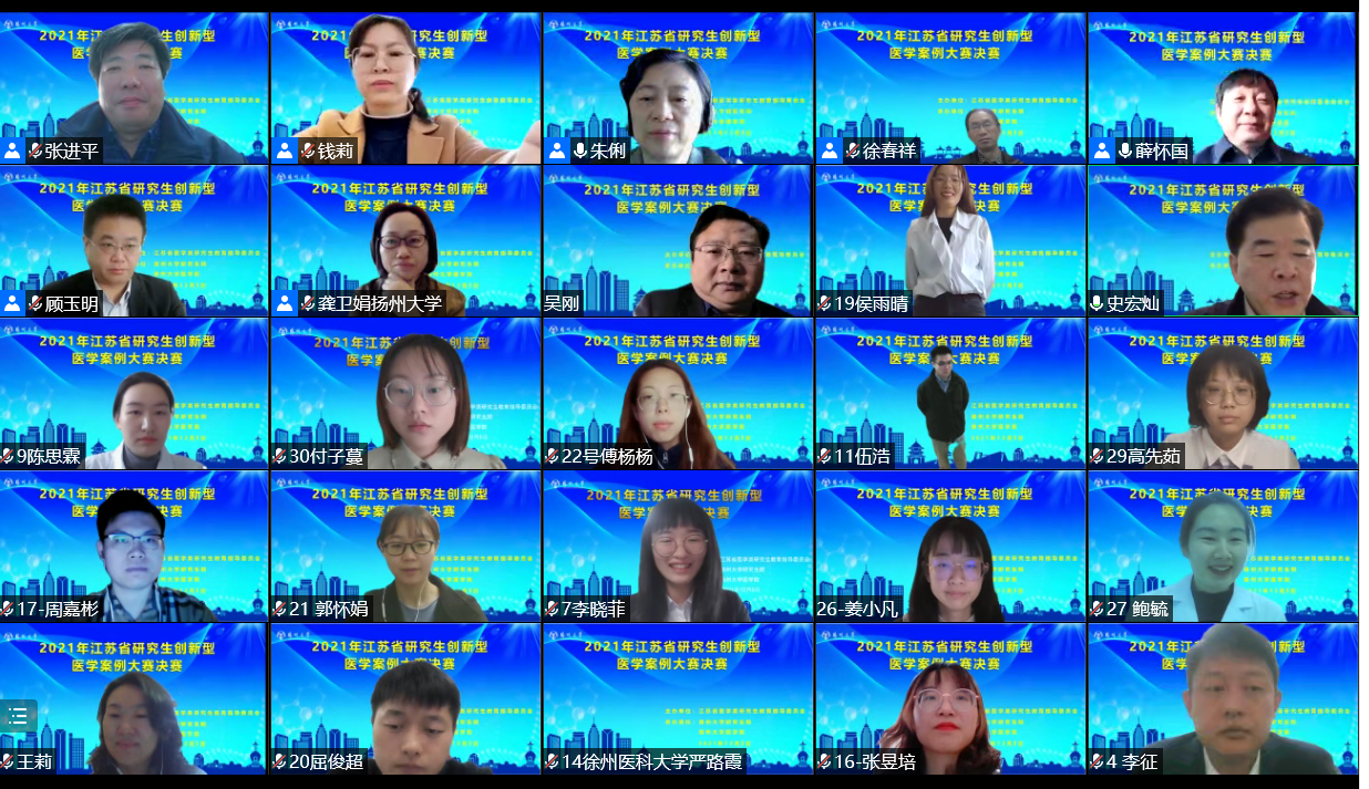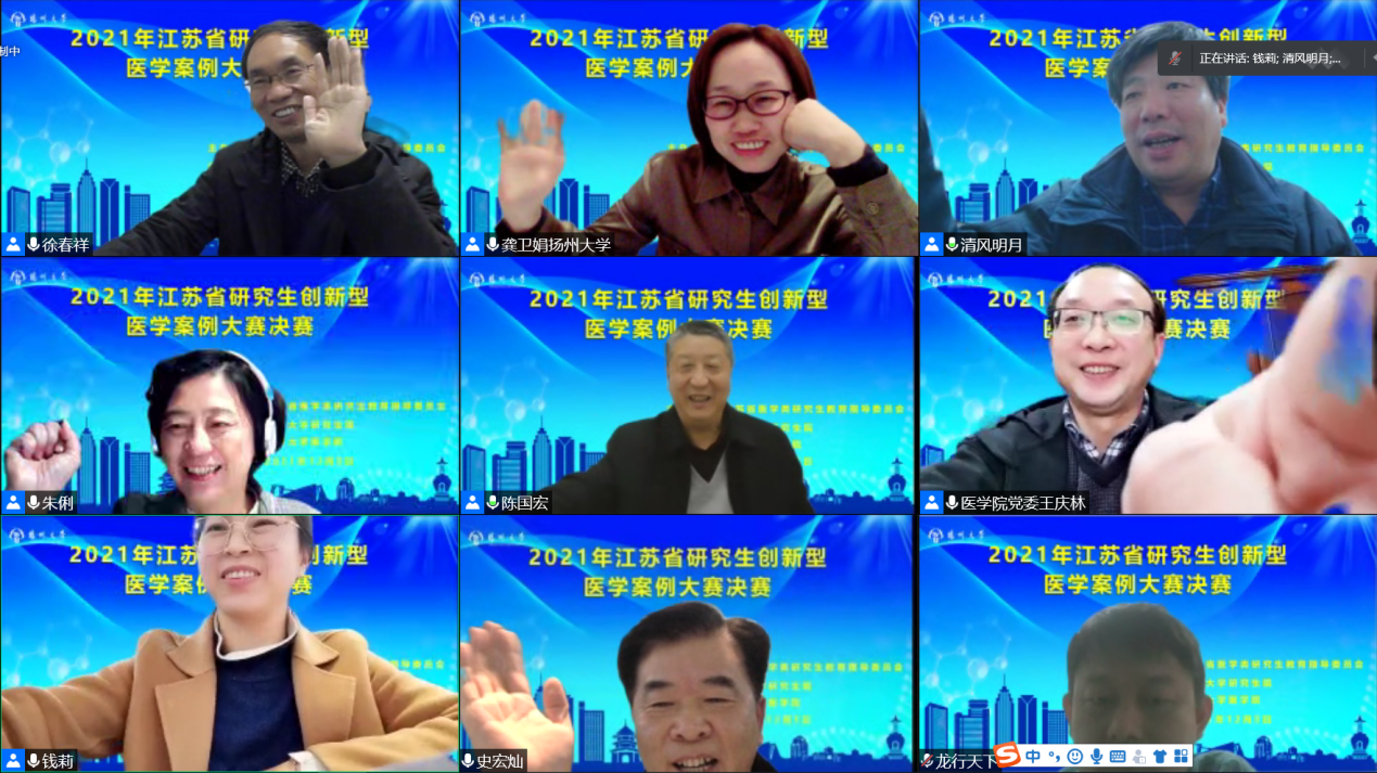12月5日,由江苏省医学类研究生教育指导委员会主办,扬州大学研究生院和扬州大学医学院承办的2021年江苏省研究生创新型医学案例大赛决赛通过线上会议的形式如期进行。为确保大赛的高水准和高质量,大赛组委会专门邀请了江苏省医学类研究生教育指导委员会委员苏州大学张进平教授、南通大学朱俐教授、东南大学徐春祥教授、徐州医科大学顾玉明教授、扬州大学龚卫娟教授担任决赛评委,对大赛进行指导和点评。决赛由扬州大学医学院院长史宏灿主持,扬州大学研究生院常务副院长薛怀国代表大会承办方致开幕辞。扬州大学党委常委、副校长陈国宏致闭幕辞。扬州大学研工部部长吴刚,扬州大学研究生院副院长吉丹如、高明国、王莉,扬州大学医学院党委书记王庆林、党委副书记花瑞锋、副院长钱莉参加了此次会议。