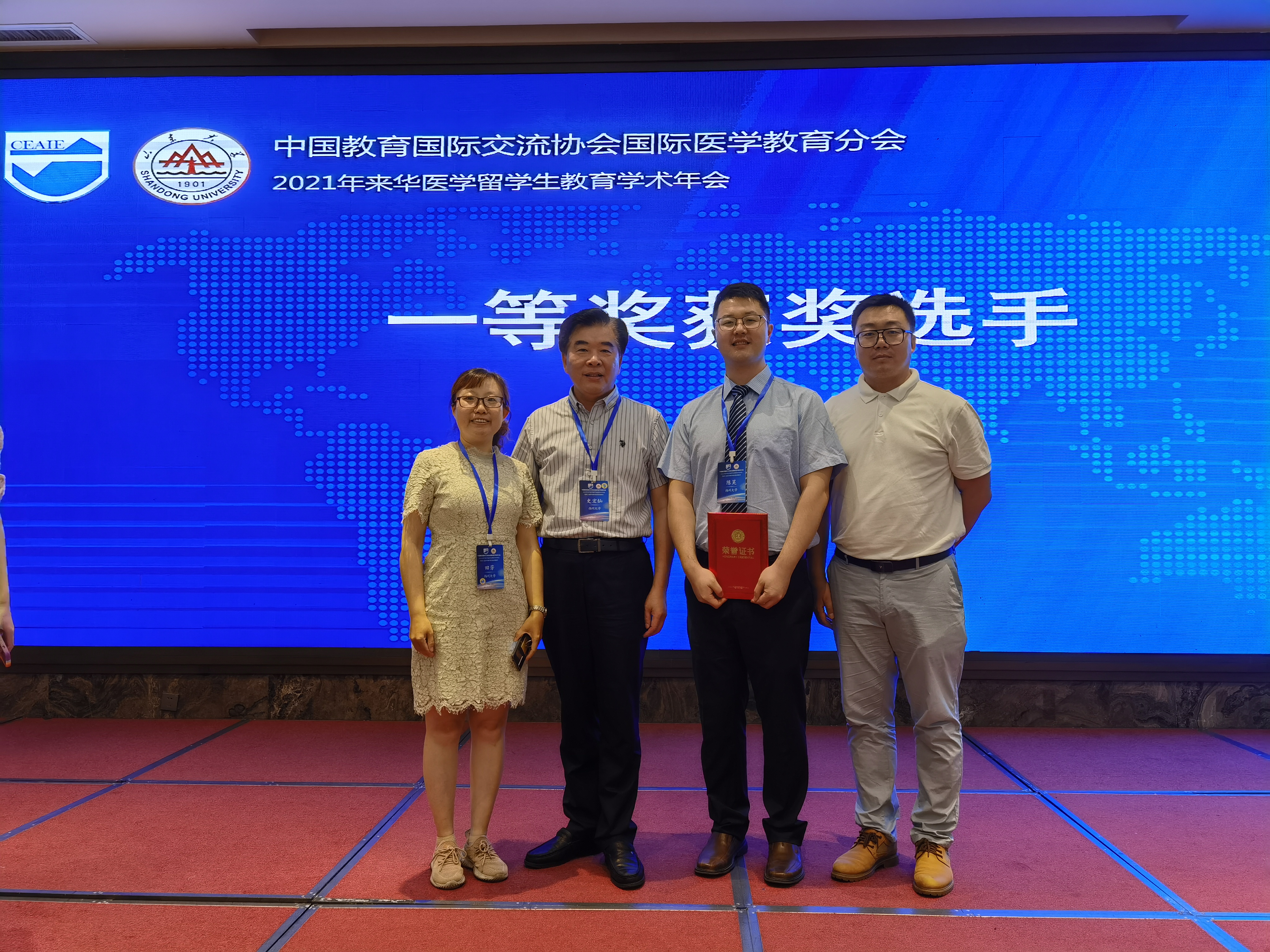 7月18-20日,中国教育国际交流协会国际医学教育分会举办的第三届来华留学生临床医学专业(英语授课)项目青年教师英语授课展示活动在山东济南举行,来自全国43所高等医学院校的选手参加了本次展示活动。我院临床医学系陈昊教授代表学校参赛,荣获一等奖,实现了我院在该赛事“一等奖”零的突破。在现场英文授课展示中,陈老师语言纯正流畅,讲解深入浅出,内容丰富充实,运用案例教学、3D动画等方法和媒介,开展启发式教学,极富感染力地完成了教学展示,受到评委专家及参赛兄弟院校的高度好评,充分展现了我校青年教师全英文授课风采和扎实的教学基本功。