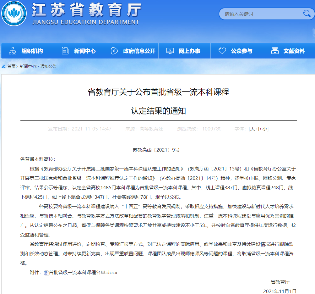 据悉,本次结果认定是根据《教育部办公厅关于开展第二批国家级一流本科课程认定工作的通知》(教高厅函〔2021〕13号)和《省教育厅办公室关于开展第二批国家级和首批省级一流本科课程推荐认定工作的通知》(苏教办高函〔2021〕14号)精神,经学校申报、网络公测、专家评审、结果公示等程序,认定全省高校1485门本科课程为首批省级一流本科课程。其中,线上课程387门、虚拟仿真课程248门、线下课程425门、线上线下混合式课程347门、社会实践课程78门。