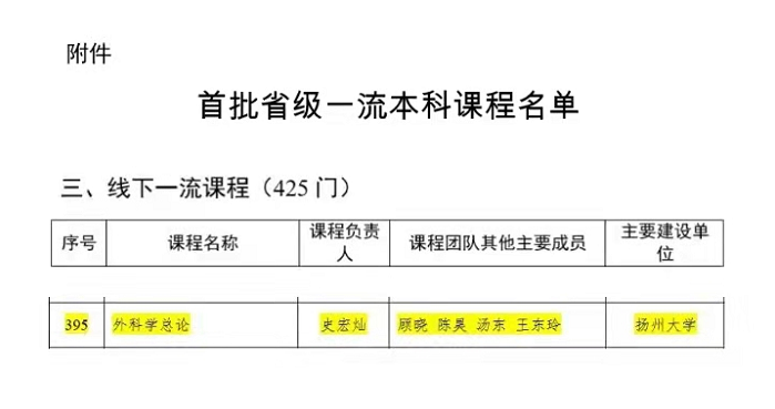 11月5日,江苏省教育厅公布了首批省级一流本科课程认定结果,我院以史宏灿教授为课程负责人的《外科学总论》课程入选首批省级线下一流本科课程。