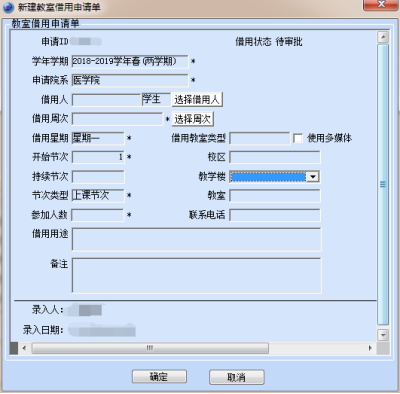 教室管理——教室借用管理——教室借用院系申请——右击右上部分空白处,新增教室借用申请