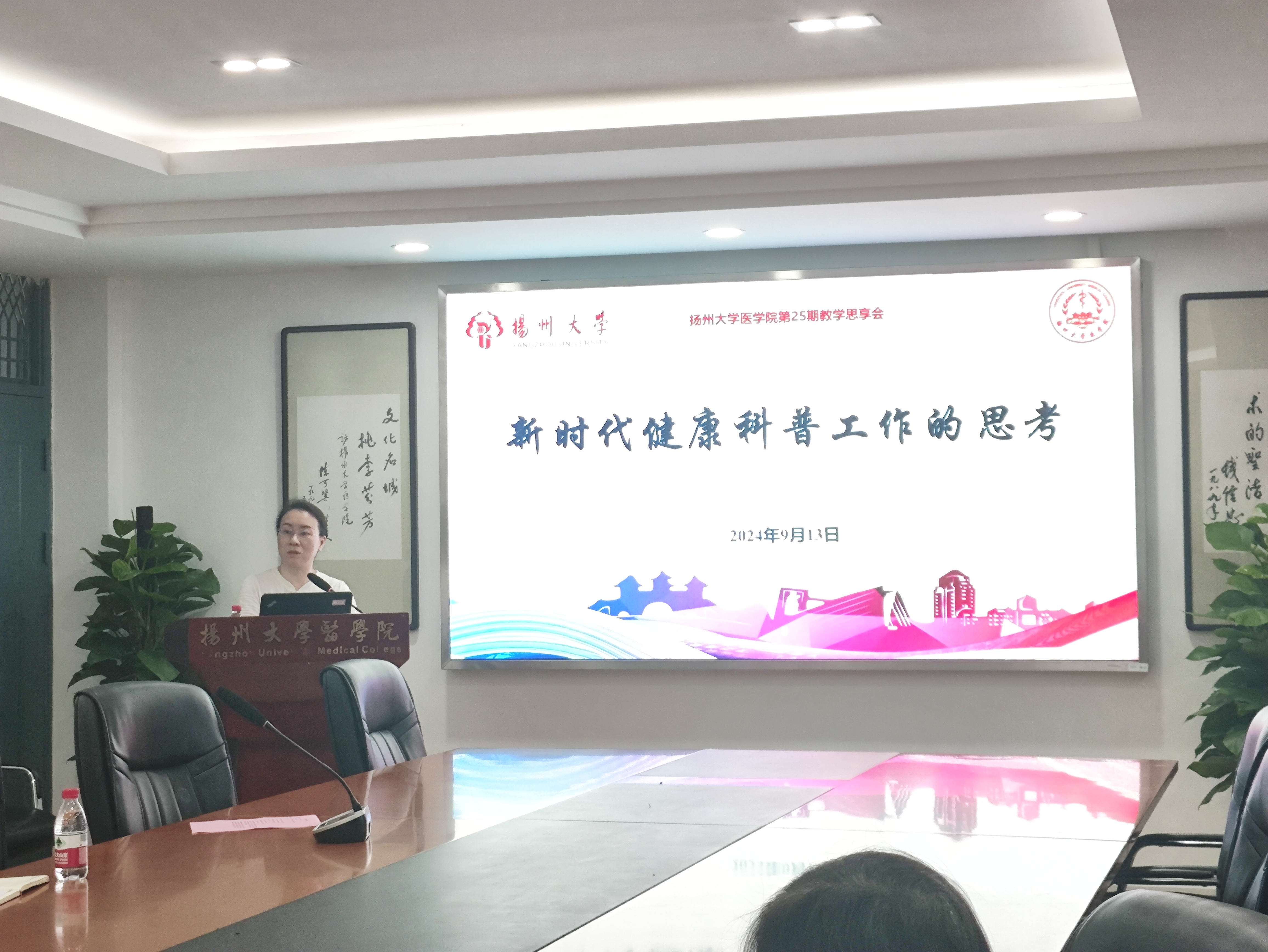 9月13日下午,我院邀请扬州市疾病预防控制中心健康教育科许婕科长作客第25期教学思享会。本次活动由基础医学与医学技术系陆凤主任主持,学院师生共计20余人参加了本次活动。