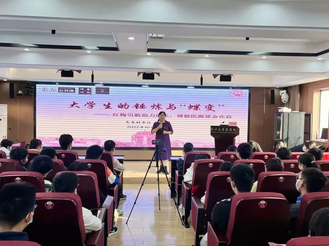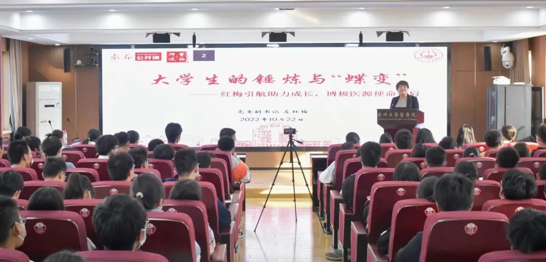 为了引导大学新生树立正确三观,培养医学生的家国情怀,10月22日下午,我院举办主题为《大学生的锤炼与“蝶变”——红梅引航助力成长,博极医源使命在肩》的素养公开课,由院党委副书记左红梅老师主讲,院团委书记许金鑫老师主持,学院辅导员及22级全体本科新生参加活动。左红梅书记围绕大学生的理想与信念、塑造与锤炼以及提升与“蝶变”三个方面开展,为大学生的健康发展和个人成长指明了方向,让同学们明确了奋斗的意义。
