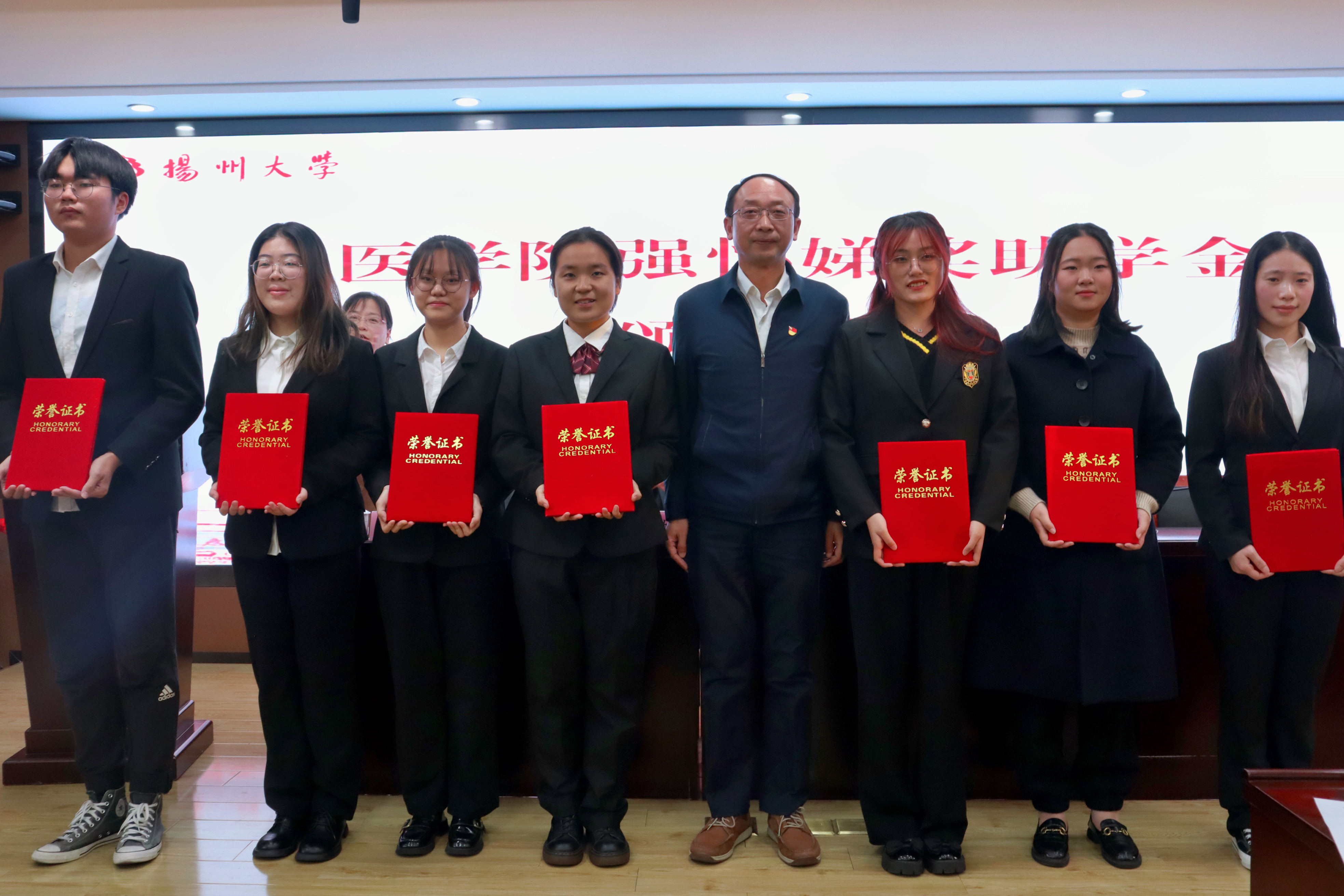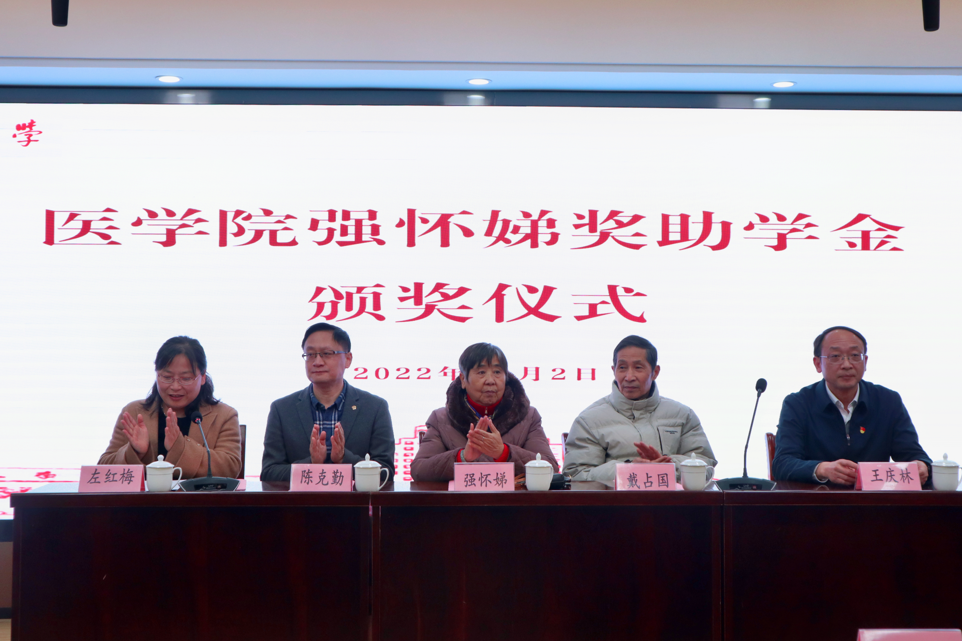 在全校上下深入学习宣传贯彻党的二十大精神和学校第四次党代会精神之际,我院隆重举办了扬州大学医学院“强怀娣奖助学金”颁奖典礼。“强怀娣奖助学金”冠名者、我院退休教师强怀娣,强怀娣老师爱人、我校原统战部副部长戴占军,校对外联络办公室、扬州大学教育发展基金会办公室主任陈克勤,院党委书记王庆林,院团委书记许金鑫出席典礼,院党委副书记左红梅主持活动。