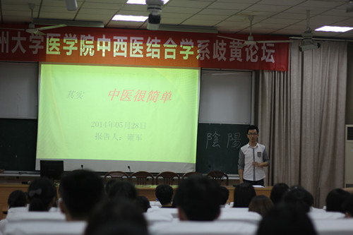 本次岐黄论坛由中西医结合学系学生会主席、大三年级雍军同学主讲。整场报告,他结合《其实中医很简单》这本书畅谈了自己对中医文化的理解,介绍了自己三年来专业学习的经验。简洁朴实的汇报风格得到了同学们的热烈回应和老师们的普遍认可。