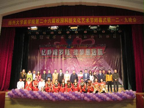 “5,4,3,2,1”。12月8日晚七点,随着观众热情高涨的齐声倒数,扬大医学院举办的第二十六届科技文化艺术节闭幕式暨一二·九晚会在农学院大礼堂隆重举办。校研究生工作部部长赵晓兰、校团委书记徐蕾、校学生处副处长李卫星、校宣传部副部长吴锡平、校研究生工作部副部长郑刚、校关工委办公室主任刘方云,和医学院党委书记王炜、党委副书记陈轶群、副院长郑英、各系领导以及院团委学工办全体老师出席了本次晚会。