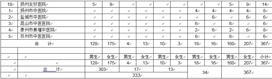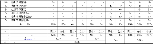 扬州大学附属医院(三甲): 男13女24 苏北人民医院(三甲): 男13女24苏州市立医院(三甲): 男10女10 常熟市第二人民医院: 男8女12 江阴市人民医院: 男7女8 南通瑞慈医院: 男10女10 太仓市第一人民医院: 男5女5 淮安市第一人民医院(三甲):女10 淮安市第二人民医院(三甲):男6女6 | 徐州市中心医院: 男4女8 宜兴市人民医院: 男6 女4 靖江市人民医院: 男8女8 泰州市人民医院(三甲): 男6女8 泰州市第二人民医院: 男10女10 泰兴市人民医院: 男7女9 兴化市人民医院: 男10女10 扬州友好医院: 男5女9 |