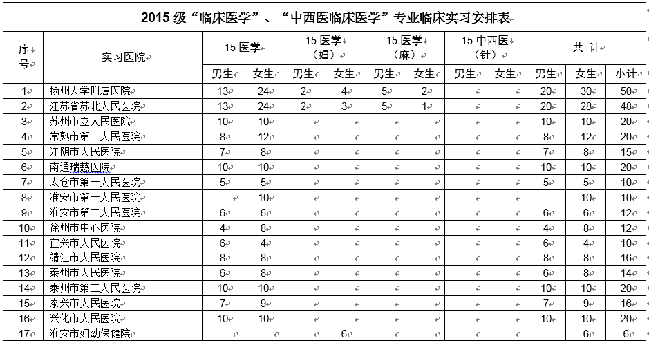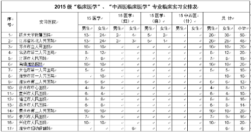 根据我院教学计划与教学进度安排,2015级在校本科生即将于5月下旬离校分赴各实习单位进行为期一年的临床实习。为做好相关工作,根据《扬州大学医学院实习分配暂行办法》(医学院〔2016〕1号)文件精神,现通知如下: