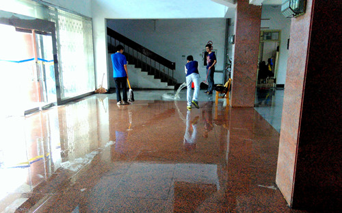 同学们以宿舍为单位,分工合作,负责各自的卫生区间。男生们主动将大厅内原先堆放的重物进行了分类和清理,尽管重物上有许多灰尘,弄脏了他们的双手,但他们的脸上丝毫没有嫌弃。待把重物清理完毕后,他们又拿起了拖把和扫帚,把地面认真仔细地清扫一遍,又拖了好几遍,直到地面看不见污物为止才结束清扫。女生们则主要负责活动房间的清理。扫地,拖地,擦窗户,她们利用自己事先准备好的抹布,用心打扫,不放过一点细节,最后,同学们还把一张张椅子整齐地摆放在角落里,细心的把原先稍显凌乱的接线板等杂物归类放置起来。