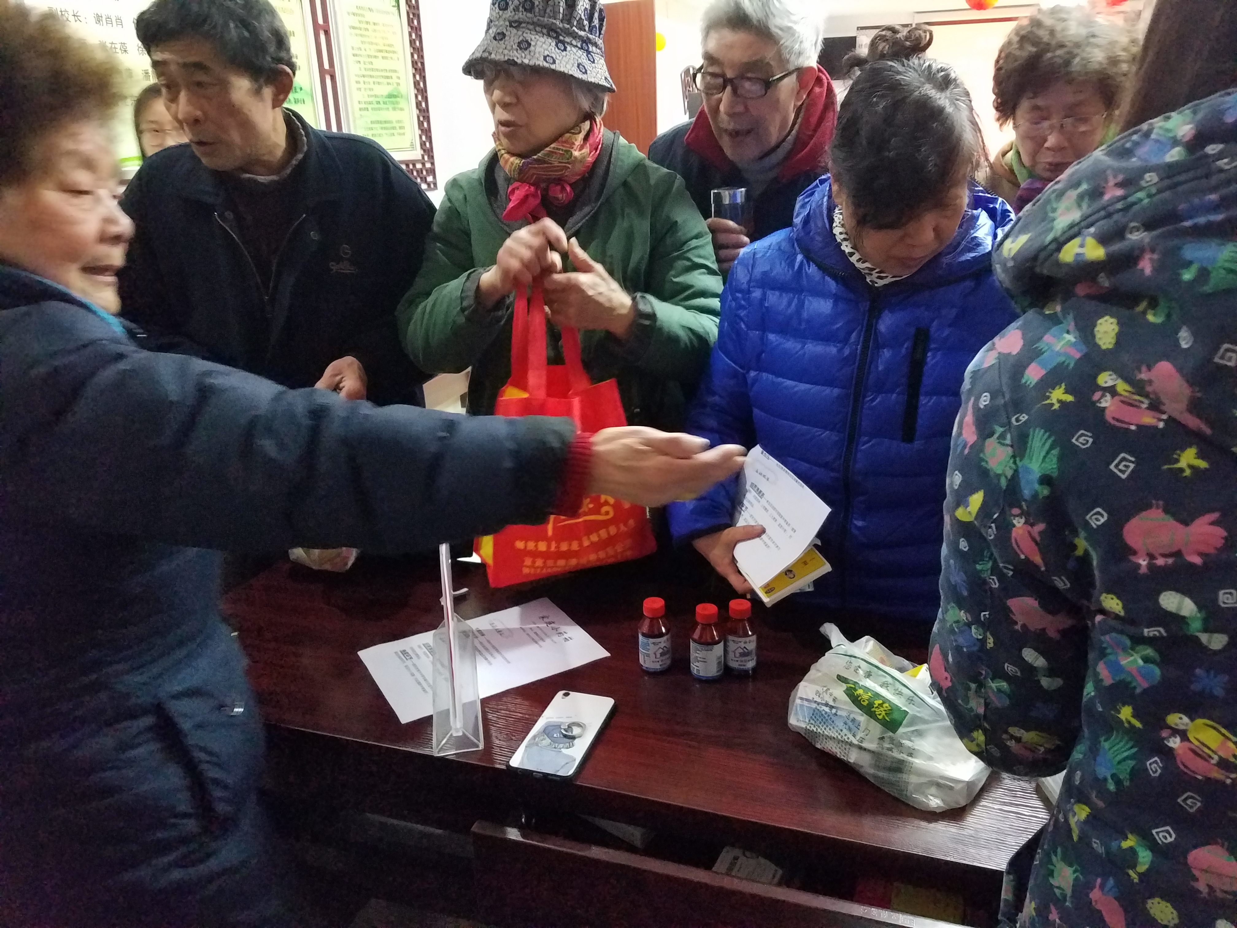 讲座结束后居民们分别进行了血压测量和旧药换新药的活动。大家很喜欢这个环节,纷纷拿出自己带来的药物换取我们提供的家常必备药品,场面十分热闹,参与旧药换新药的居民可以参与抽奖,从中产生的幸运居民获得了我们专门提供的装有家中常备药材的小药箱。还有一些居民到我们的义务量血压处测量血压,临床系的两位学生非常有耐心的接待了每位居民,并且针对他们的血压测量结果给他们提供了一些建议,对于刚刚运动过血压不太稳定的老人,他们细心地让其休息十分钟在进行测量,这样测量的结果更加准确。