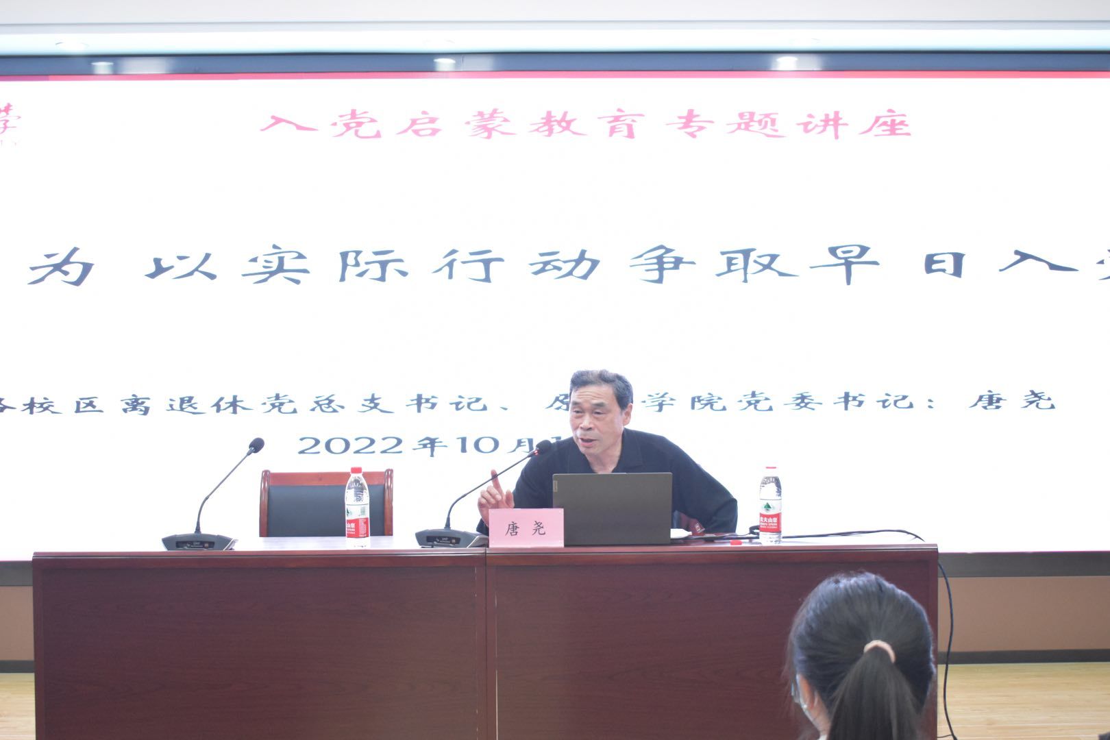 10月16日,党的二十大胜利召开,习近平总书记所作的报告让每位学子无比振奋,对青年的寄语更让大家倍感力量。青年兴,则国兴。为了进一步让医学院的大一新生体悟中国共产党的初心使命,引导大家积极向党组织靠拢,为同学们指明前进方向,10月16日晚,我院在路北校区5号楼401举办了一场以“亲历亲为,以实际行动争取早日入党”为主题的入党启蒙讲座。本次讲座以线上线下相结合的方式,邀请了淮海路校区离退休党总支书记、原医学院党委书记唐尧老师担任主讲嘉宾,院团委书记许金鑫老师主持。