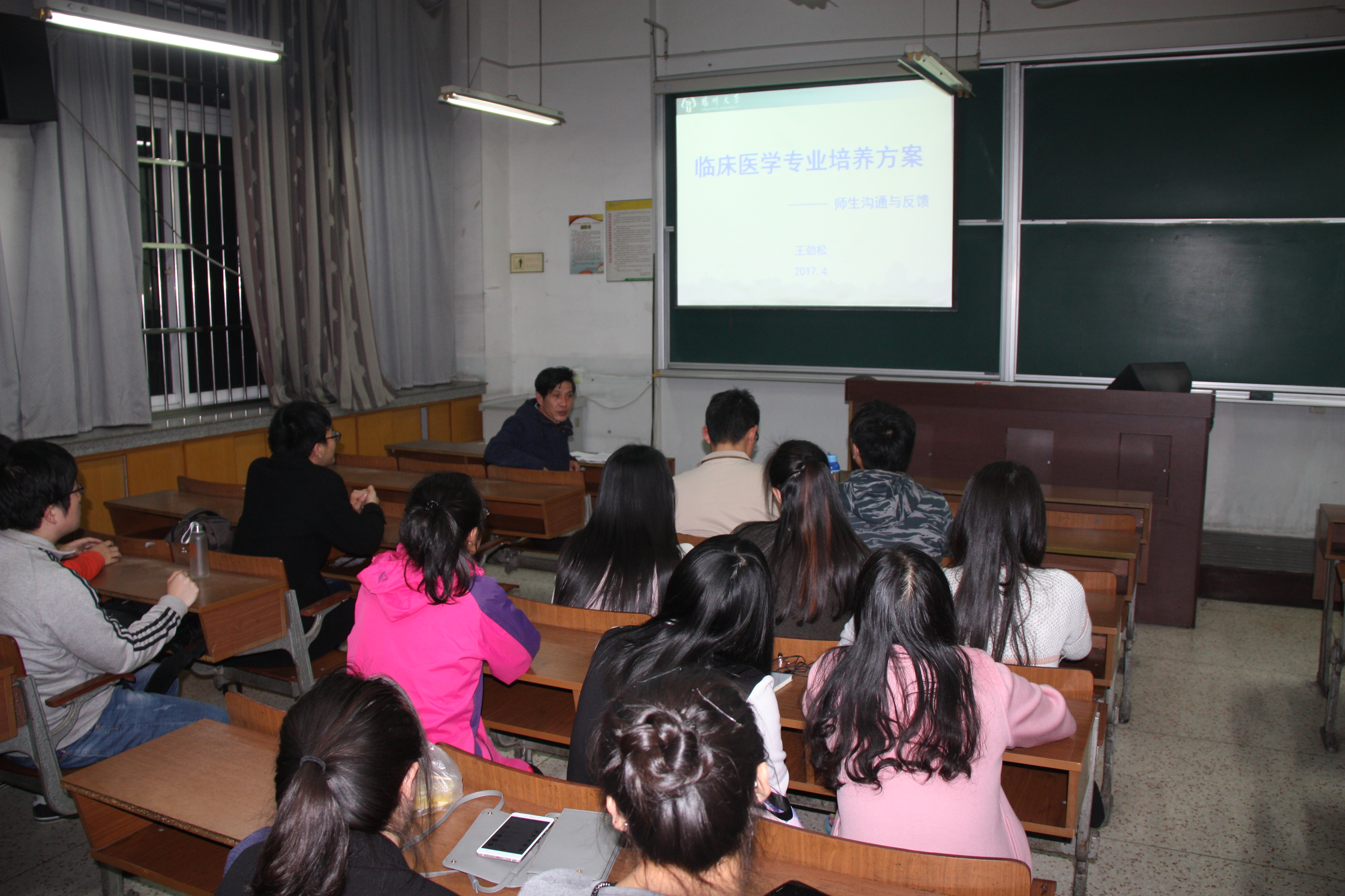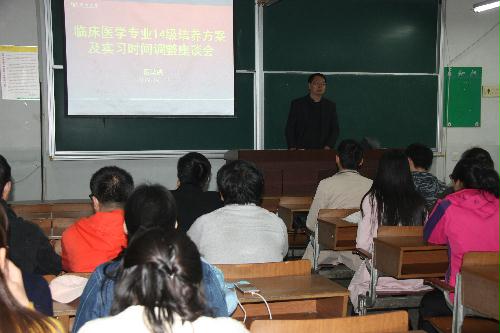 2017年4月13日晚,学院召开了临床医学专业培养方案调整学生座谈会。副院长王劲松老师、院学工办毛蒋楠老师以及临床医学系2014级四十余名同学参加了座谈。座谈由教学办葛扬军老师主持。