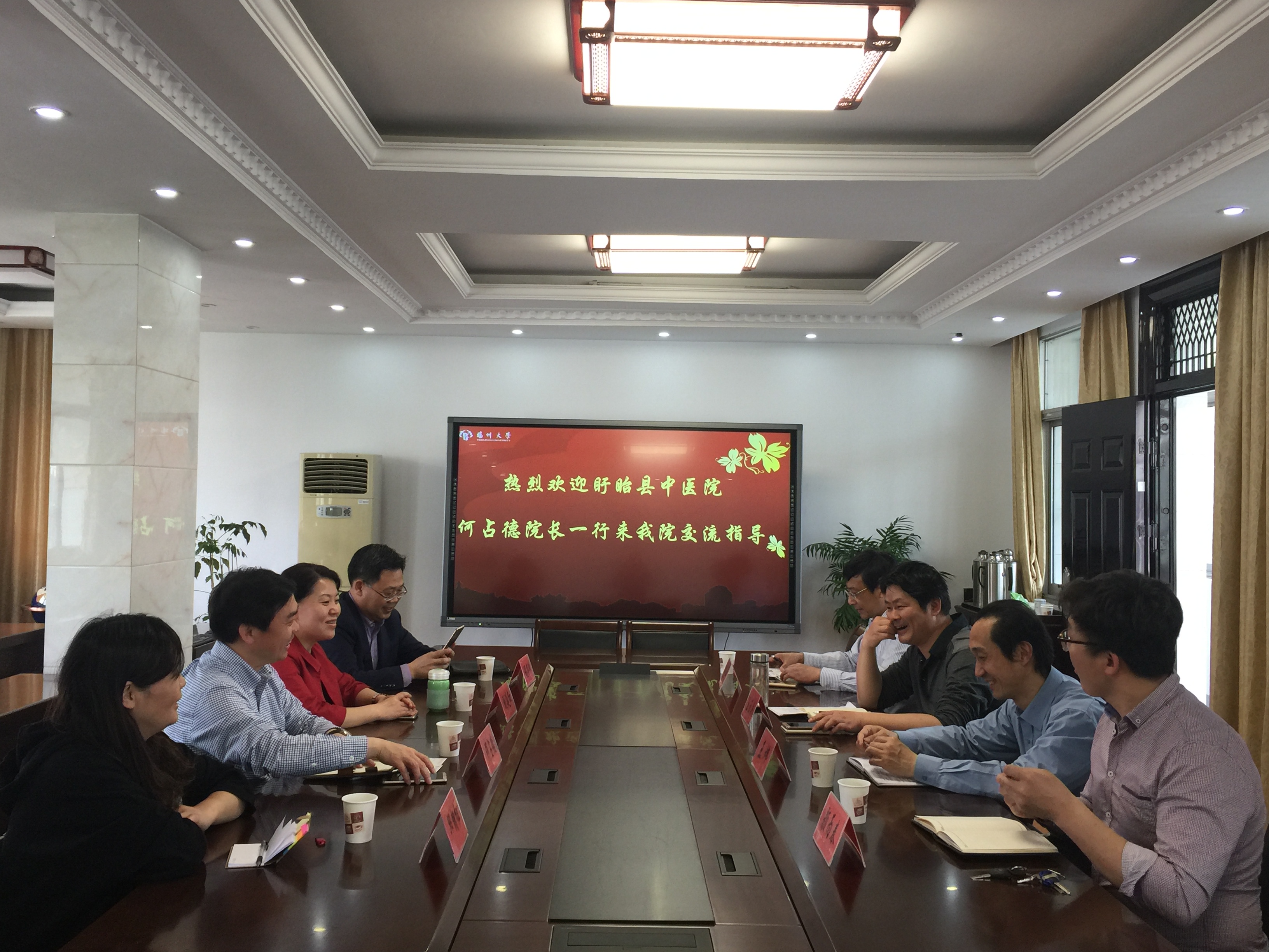 4月19日下午,盱眙县中医院院长何占德、副院长刘延红、医教部主任邱朝红、我院97级校友程华刚一行4人到我院洽谈相关合作事宜,党委书记王炜、副院长王正兵、中西医结合学系主任颜丙春、分管实习工作的景丰老师等热情接待。