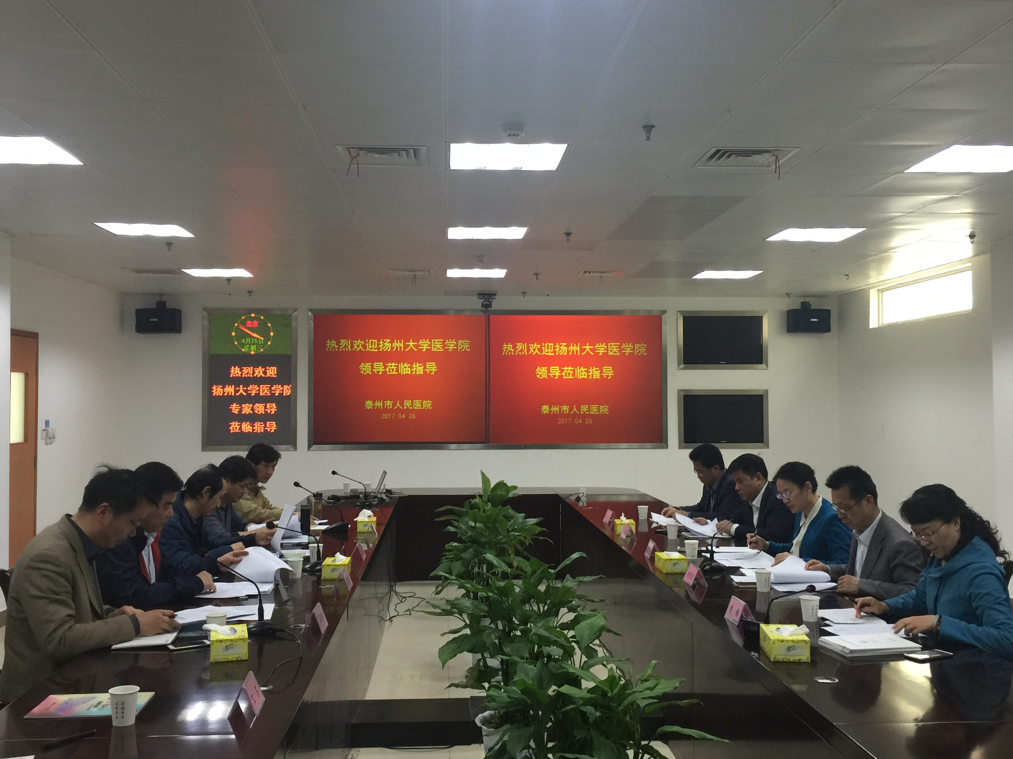 近日,医学院党委书记王炜、院长史宏灿等一行到扬州大学医学院附属医院泰州市人民医院就临床医学专业认证的准备工作进行沟通交流。泰州市人民医院院长、校友朱莉,副院长商继华、办公室主任殷屹岗、教育科科长鲁梅及有关人员出席。