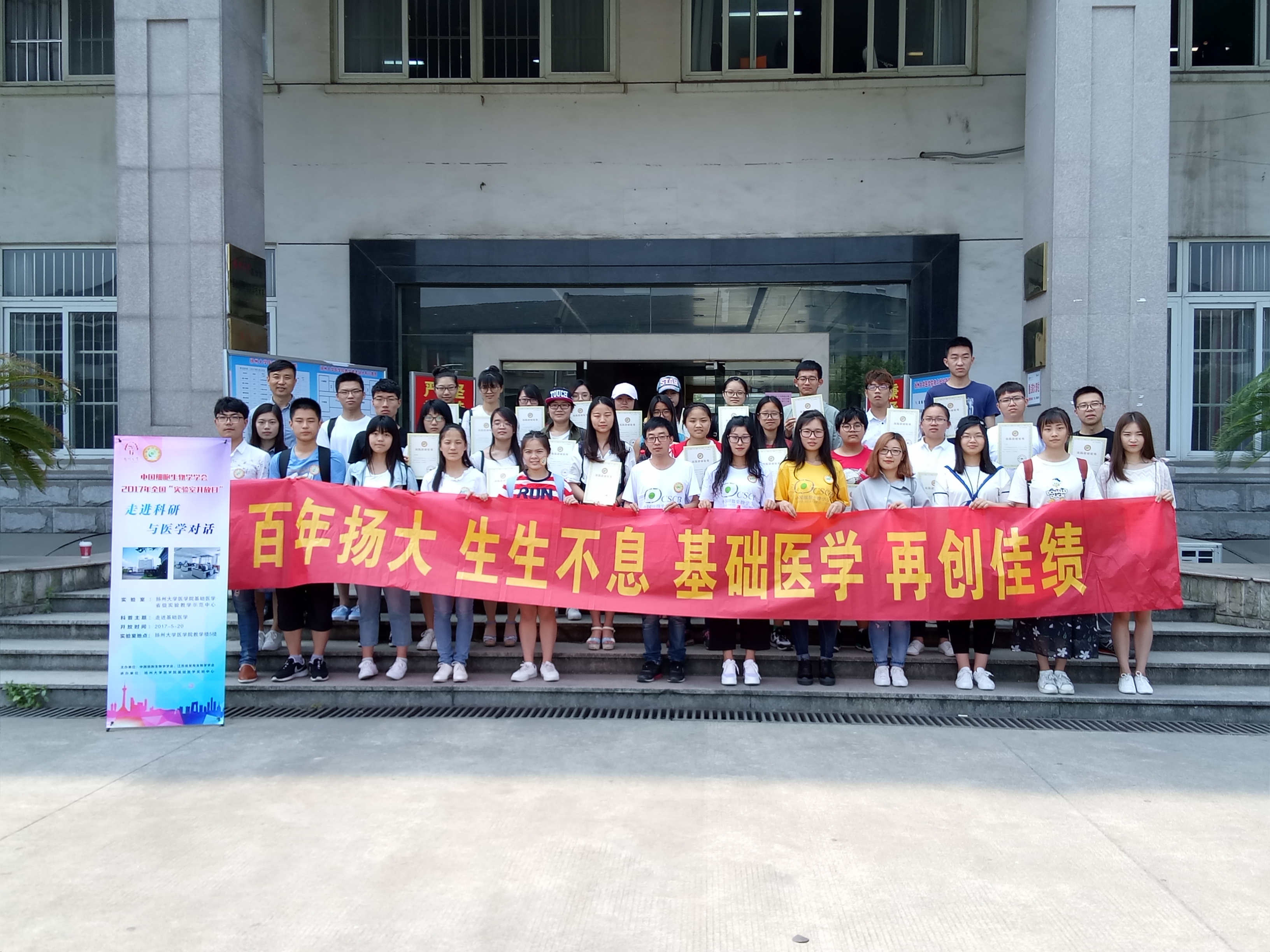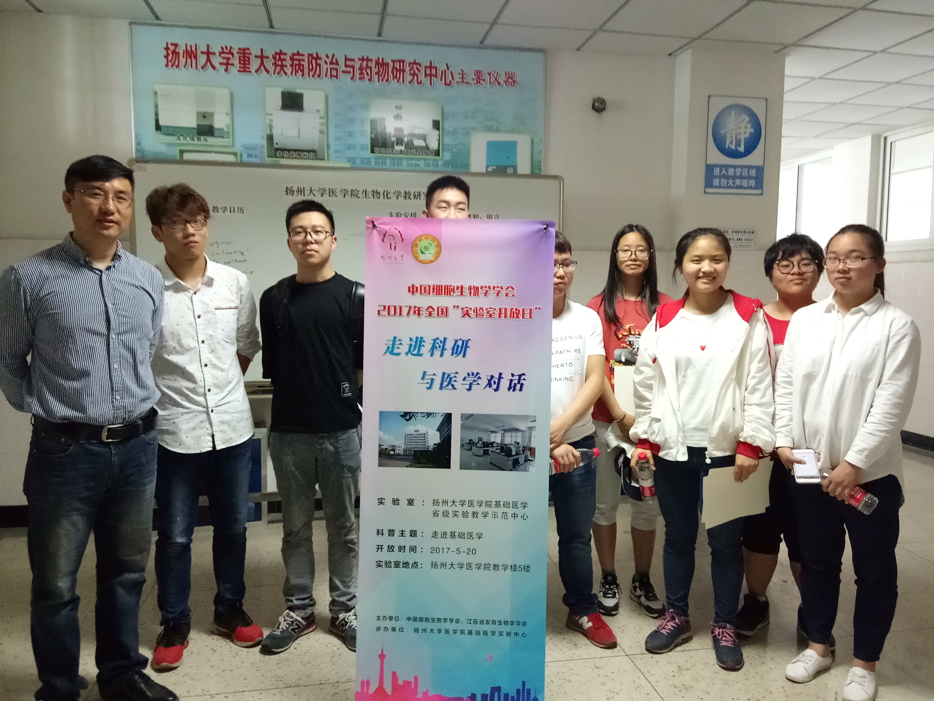 为响应中国科协和中国细胞生物学学会及江苏省发育生物学学会加大科普活动力度的号召,由基础医学与医学技术系、基础医学省级实验教学示范中心、基础医学与医学技术系大创实验室倡议的主题为 “走进科研,与医学对话”的实验室开放日活动于2017年5月20日在学院成功举行。来自广陵学院、兽医学院、动物科学与技术学院、机械工程学院、信息工程学院、新闻与传媒学院、环境学院等学院的一年级大学生,以及基础医学与医学技术系老师、研究生、医学检验专业本科生总计37人参加了活动。