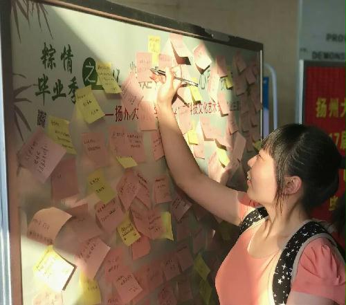 一旁的留言板上,同学们在便签条上纷纷写下了最想对扬医说的话,“遇到你们是我大学五年最大的幸运。”“母亲啊,我还不想长大。母校啊,我还不想离开。你已镌刻入我的脑海,直伴一生。”一句句真挚的话语,表达着不舍与眷恋。