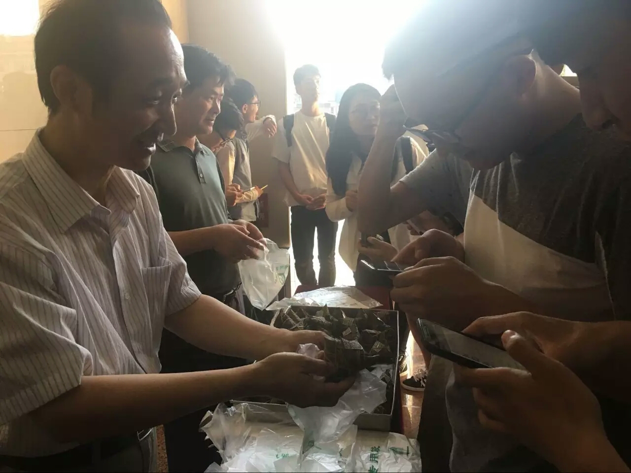 在教学楼送出毕业粽以后,各系老师也带着粽子走进毕业生宿舍,为还没有拿到粽子的其他同学亲自“送上门”。同学们和老师热情地拥抱问好,接过热乎乎的粽子,有的继续和老师聊天,有的就迫不及待拆开吃了。这温情的送粽子活动持续到天黑,老师们才和同学们的依依惜别。