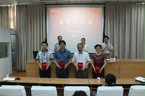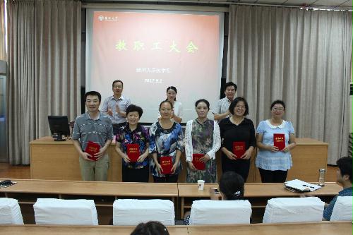 会上,陈轶群副书记宣读了有关表彰决定,院领导为2015-2017年度院优秀共产党员获得者王芬、许金鑫、徐志勤、高慧、孔祥、钱静、许爱华老师、2016-2017年度校“最受学生欢迎的任课老师”获得者沈维干、徐海荣老师、校2016年度优秀教学一等奖史宏灿、二等奖郑英,王正兵老师及学院讲课比赛一等奖徐海荣,二等奖方蕾、潘博,三等奖刘星、陆凤、吴如燕、寇玉等老师颁发荣誉证书