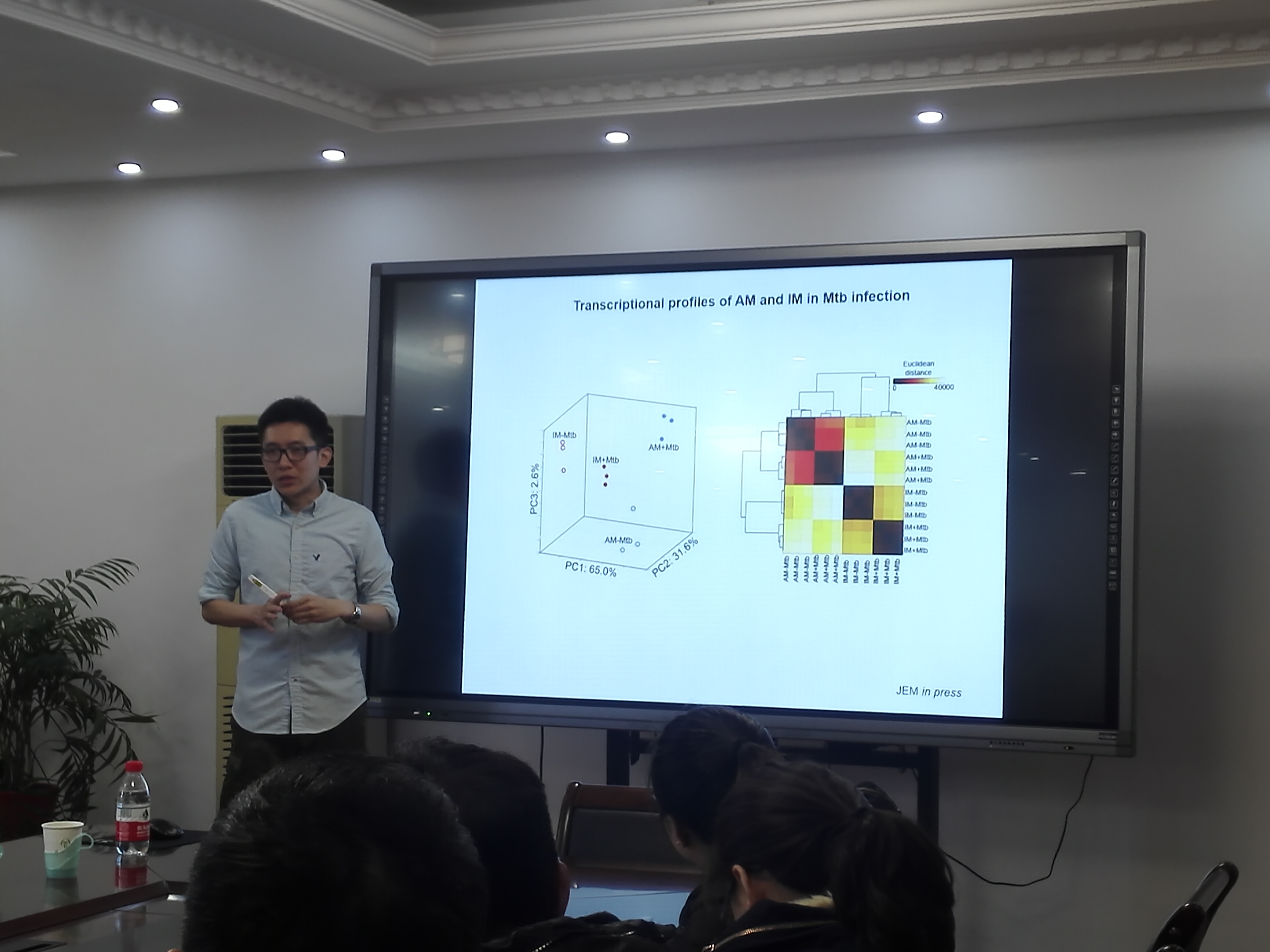 黄路博士以结核分枝杆菌感染免疫研究为基础,介绍了肺结核分枝杆菌感染后肺两种巨噬细胞的变化和发育机制,探讨了结核杆菌在两种巨噬细胞中的分裂增殖的差别及其机制,介绍了研究中运用的新技术和方法。报告会内容丰富精彩,给老师和研究生很大的启发,与会老师和同学与黄博士进行了请教和交流。