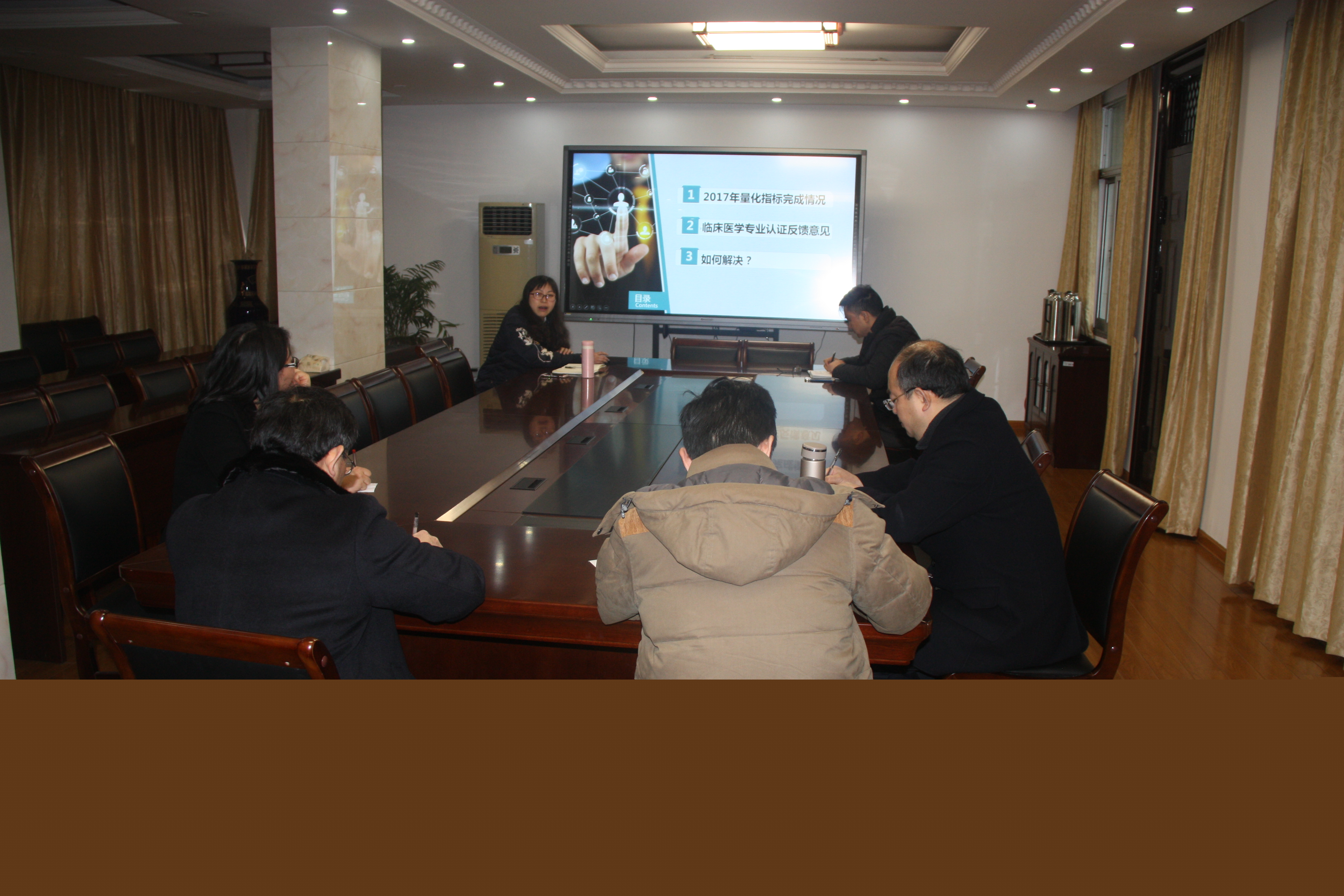 本次会议主要分为二个阶段。第一阶段,钱莉副院长对2017年学院本科教学量化指标完成情况进行了详细解析,并根据临床医学专业认证专家提出的改进建议,谈了后续本科教学工作的整改思路和设想,要求各系以认证后整改为切入点,结合各系自身特点,抓住教学改革这一核心环节,充分调动教师参与教学改革的积极性,力争在教改论文发表及本科生毕业论文的质量上有所突破。