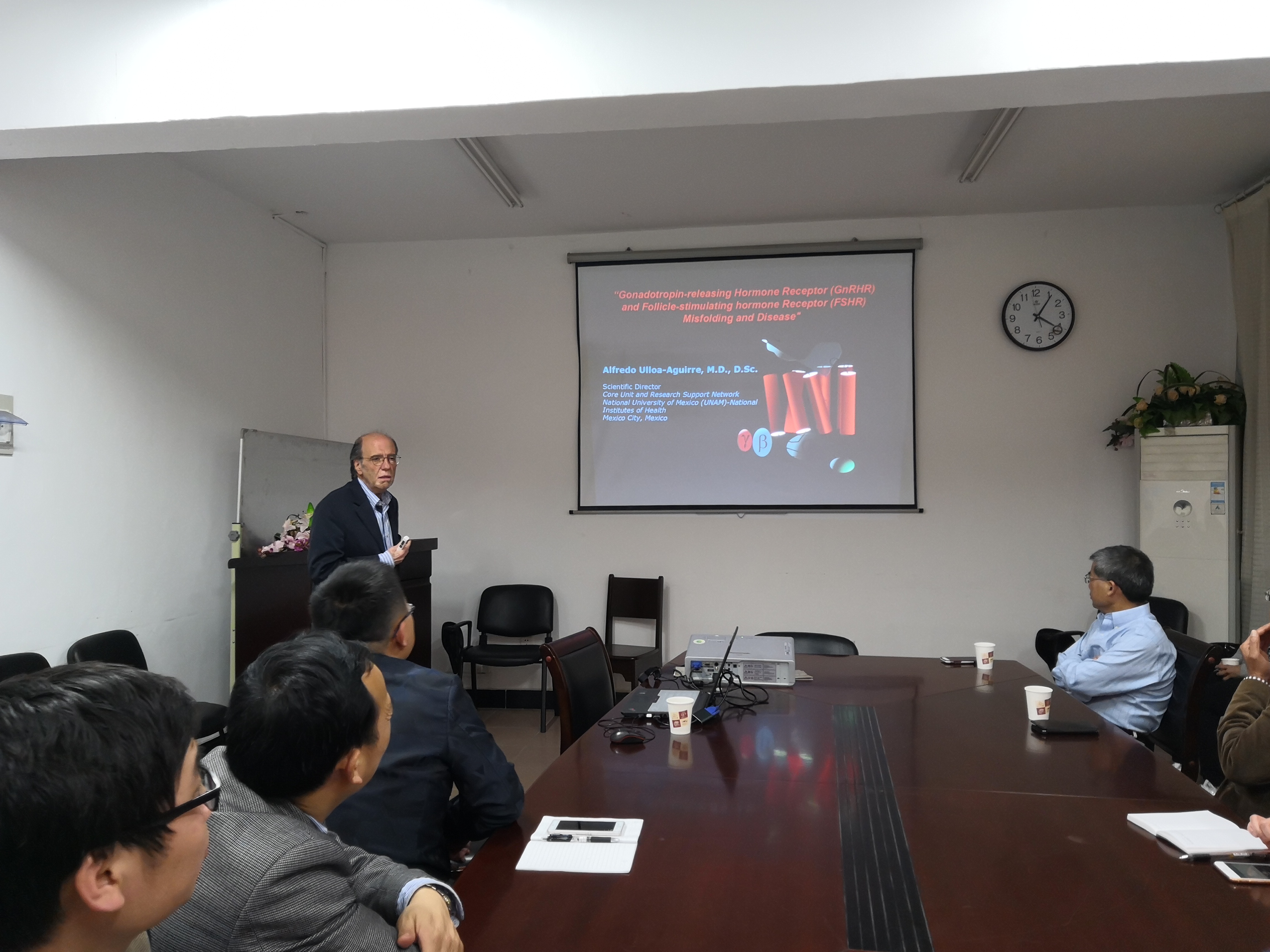 Alfredo Ulloa-Aguirre院士分享了多年来从事的内分泌系统研究领域的研究成果,重点介绍了促性腺激素释放激素的生化和功能研究,并探讨了促性腺激素受体不同基因突变在动物及人群中研究成果,分析了促性腺激素受体翻译后修饰与细胞内转运调控的机制。报告会内容丰富,生动详细,其开展的研究极具启发性,引起了在座师生的热烈交流与讨论。