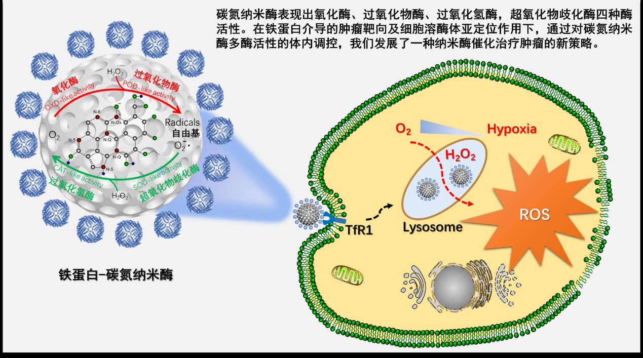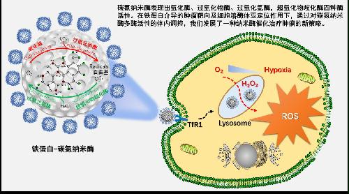 该研究设计发明了具有多重酶活性的新型碳氮纳米酶,并利用铁蛋白的导航,在体内实现纳米酶的精准递送和酶活调控,利用肿瘤特征性的代谢产物,发挥对肿瘤特异而高效的杀伤作用,建立了纳米酶靶向催化治疗肿瘤的新策略,为肿瘤治疗提供了新的思路和技术。
