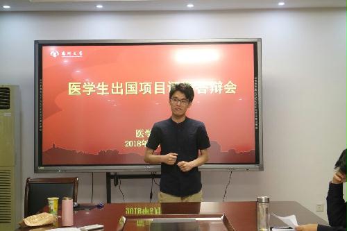 为推进本科生国际化进程,医学院从2016年开始,每年选拔优秀学生赴美国、日本等地进行学习和交流,取得了良好的效果和反响。2018年海外交流项目启动后,咨询和报名的同学众多,学院于2018年5月9日晚7点在院四楼会议室举行答辩评审会,对报名同学进行了语言能力、出国目的、综合素质等多方面的考察。会议由院党委副书记陈轶群老师主持,副院长王正兵老师、副院长钱莉老师、基础医学系梁景岩老师、院办公室高旭老师、学工办王安庐老师参加了本次评审会。