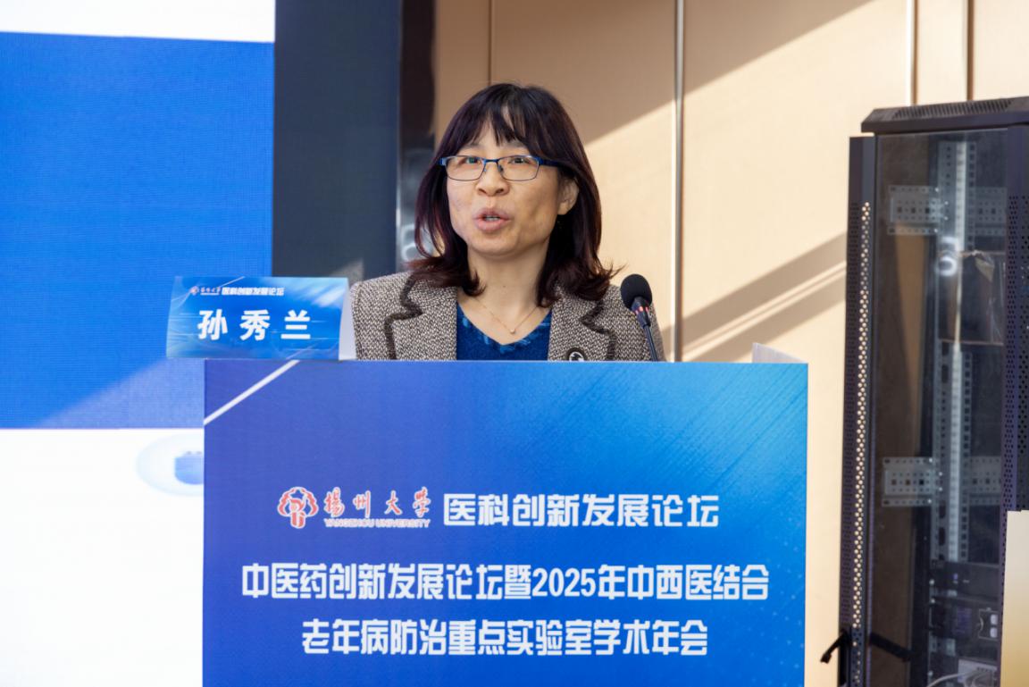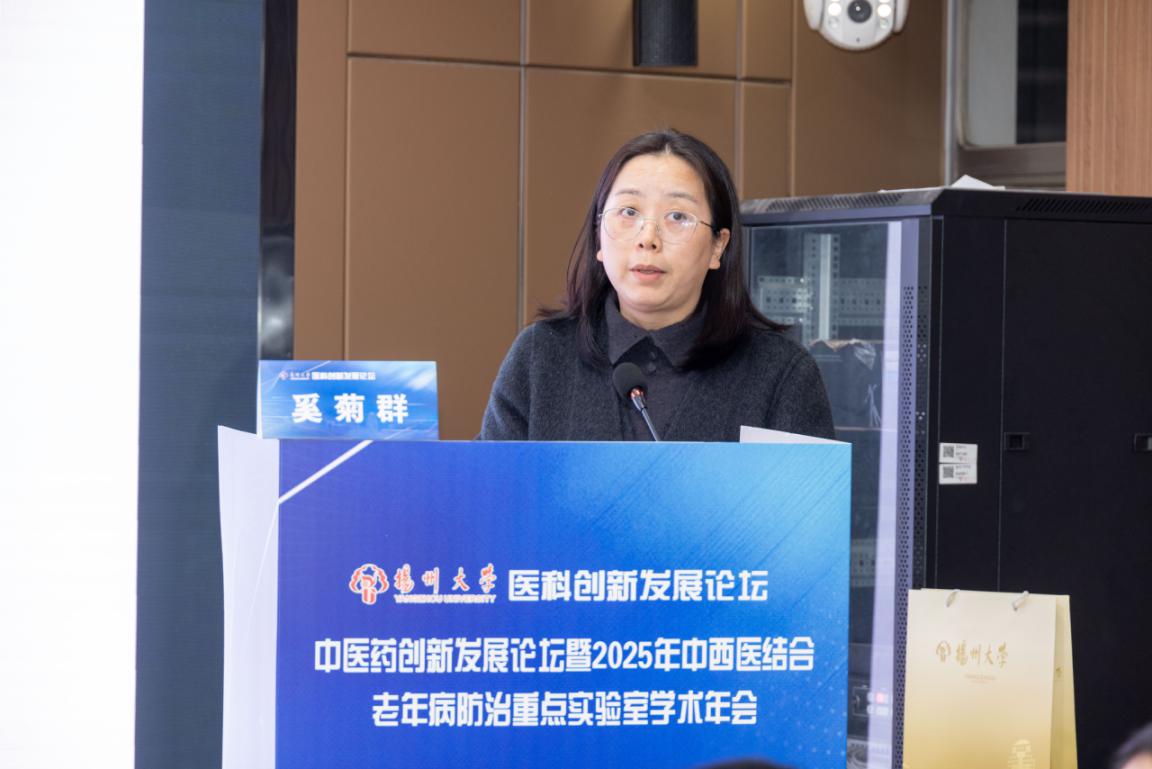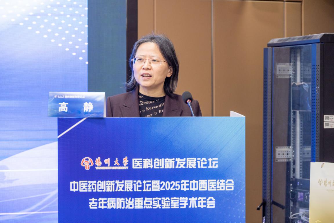 中医药创新发展论坛暨2025年中西医结合老年病防治重点实验室学术年会在路北校区5号楼401举行。论坛特邀南京中医药大学副校长孙秀兰、江苏省中医药发展中心主任冯广清、华中科技大学胡德胜教授、中国药科大学李飞教授、南京中医药大学吕志刚教授及扬州大学奚菊群教授作报告。医学部中医药学院党委书记高静出席并讲话,院长颜丙春主持论坛。