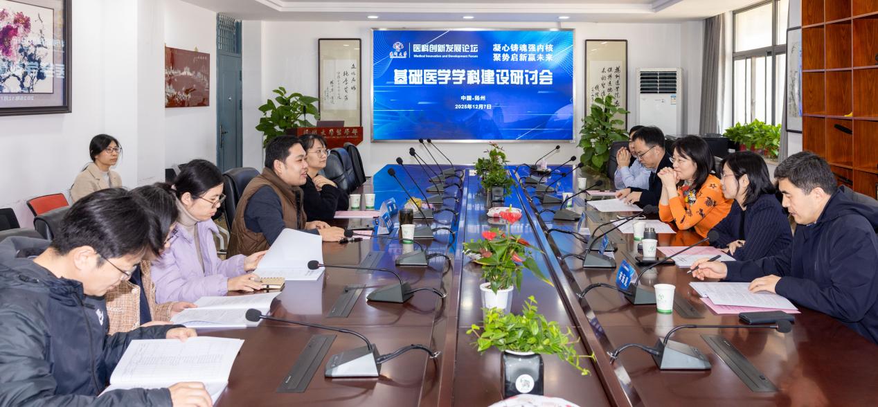 基础医学学科建设研讨会在路北校区19号楼810会议室举行。研讨会由医学部副主任路国涛主持,特邀中国医科院苏州系统医学研究所执行副所长马瑜婷、上海交通大学医学院全球健康学院常务副院长王兆军、徐州医科大学基础医学院副院长宋远见、南京医科大学基础医学院党委书记陈峰、附属苏北人民医院原党委书记徐道亮组成专家组。医学部基础医学院·公共卫生学院院长陆凤、基础医学学科骨干教师代表参会。
