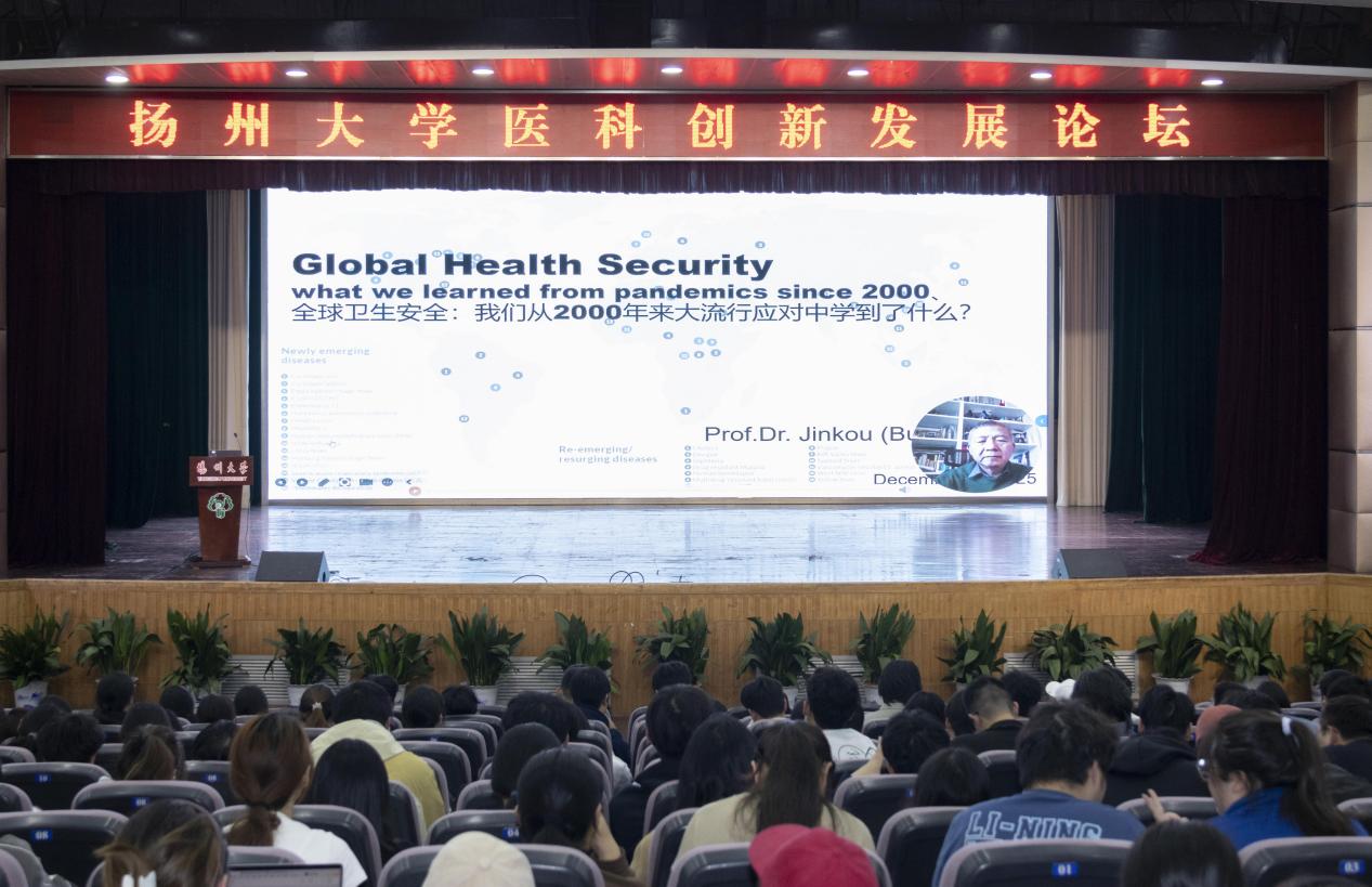 12月7日,扬州大学医科创新发展论坛在荷花池校区大学生活动中心三楼小剧场举行。我校党委书记丁建宁、校长刘巧泉,江苏省卫生健康委员会副主任鲍军,扬州市副市长刘流,我校副校长赵文明、王承堂、韩杰,中国科学院院士、我校校友李劲松,扬州市卫生健康委员会党委书记尹成雷、主任王劲松,扬子江药业集团党委副书记蔡伟等出席开幕式。副校长龚卫娟主持开幕式。