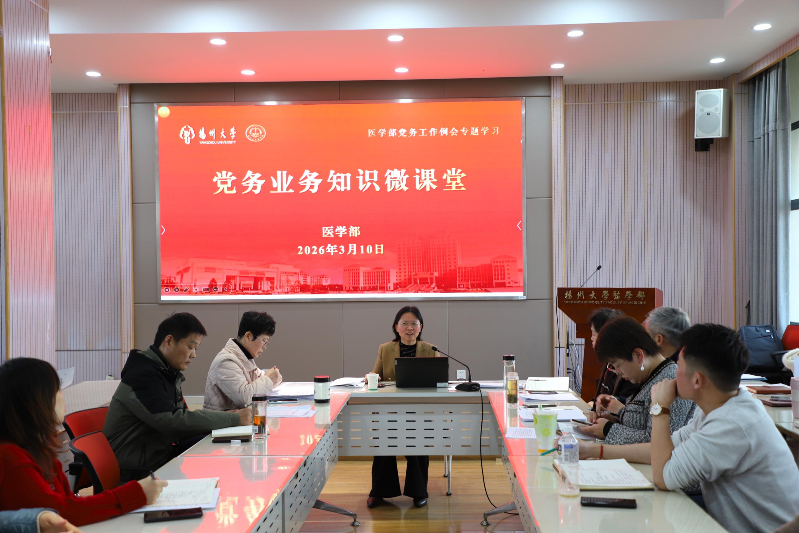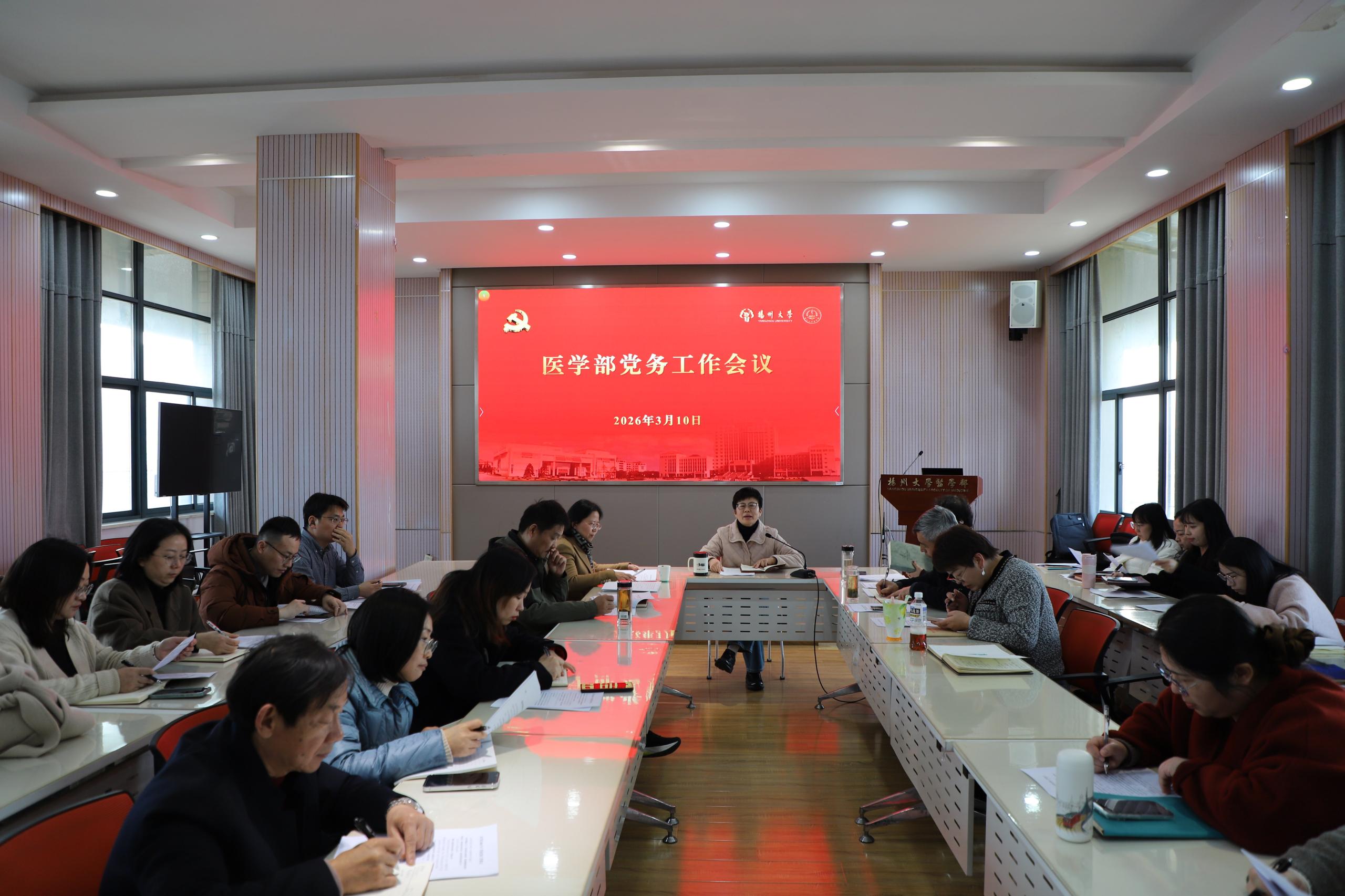 3月10日下午,扬州大学医学部在路北校区19号楼9楼报告厅召开党务工作例会。学部及下辖学院党委领导,全体党支部书记参加会议,会议由医学部党委书记吕红梅主持。