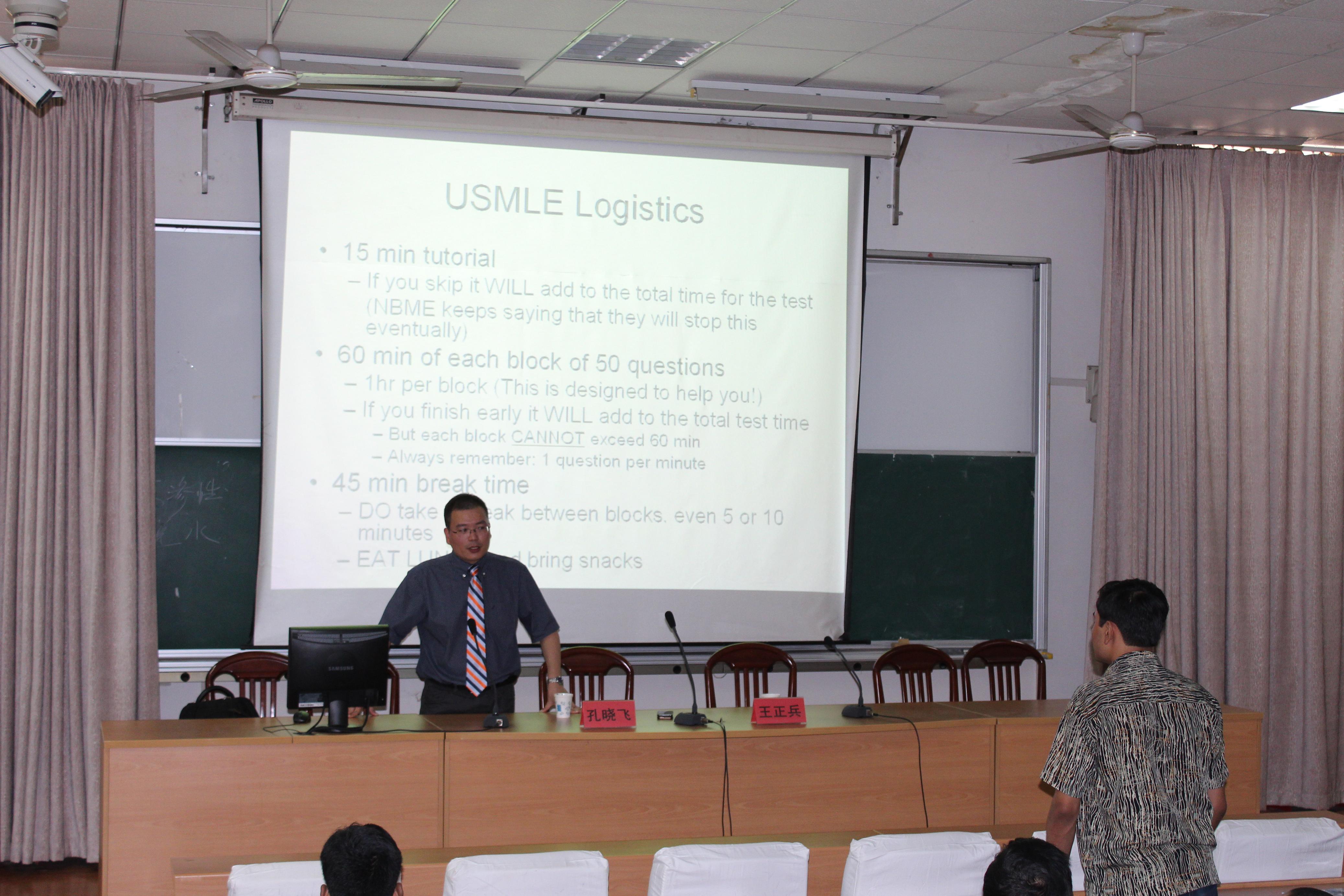 9月3日上午,我院杰出校友孔晓飞博士应邀回母校为我院MBBS留学生作了题为How Did I Prepare for USMLE (我是如何准备美国执业医师资格考试)的学术报告。报告由王正兵副院长主持,MBBS全体留学生听取了报告。