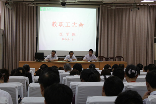 史宏灿院长总结了上学期的主要工作,布置了新学期的重点工作。史院长着重强调了内涵、特色、创新是学院工作和发展的总基调,也是学院长远发展的永恒主题。我们要充分利用学校深化综合改革、提升医科和推进直属附属医院建设为契机,结合目前学院在人才培养、科学研究、学科建设、学术队伍和社会服务等方面的实际情况,在内涵建设上下功夫,在强化特色上做文章,在创新发展上动脑筋。坚持走内涵式发展道路,深化综合改革,创新内部管理机制,以特色发展促进质量提升,通过创新培养机制,探寻新的优势和增长点。史院长还从人事、本科生教育、科研、医学教育国际化等方面详细阐述了学院的改革措施,并提出了努力方向。
