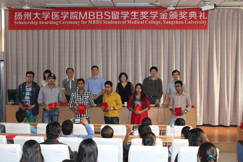 MBBS留学生奖学金分为一、二、三等奖和单项奖共四类,用于奖励学习成绩优秀、综合表现良好或在某一方面有突出表现的留学生。2013-2014学年度共有45名MBBS学生荣获不同等级的奖学金,占在读MBBS留学生总人数的21.1%。