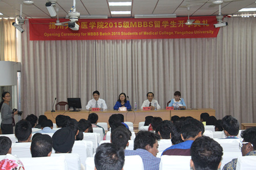 10月21日下午,我院2015级全英文授课临床医学专业(MBBS)留学生开学典礼在淮海路校区报告厅隆重举行。海外教育学院院长郭丽、医学院党委书记王炜、副院长王正兵,以及医学院全体留学生班主任和2015级MBBS新生出席了开学典礼。
