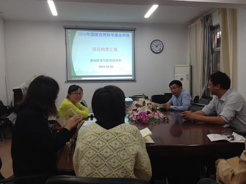 会上,我系拟申报2016年国家自然科学基金项目的11位教师逐一从研究背景、研究思路、研究内容和已有的研究基础等方面对拟申报项目进行了详细介绍。与会专家从选题创新性、研究价值、科学问题的凝练和标书的撰写技巧等方面对每个项目进行了细致的点评并提出了指导性的意见和建议。