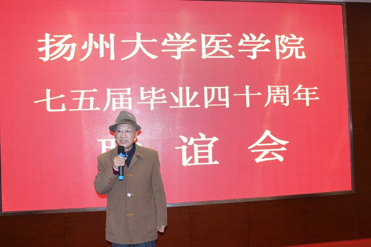 联谊会上,医学院王炜书记代表学院致辞,向共聚一堂的四代扬医人介绍了学院目前发展的情况,尤其是合并20多年来所取得的发展成就,唐尧、杨邦杰等作为教师代表先后发言。75届同学代表、美国加州大学洛杉矶分校公共卫生学院流行病学系主任张作风教授等分别发言,提议要加强同学之间、与母校之间的联系,张教授还立足本专业,倡议大家要坚持健康生活方式,身体力行。老师和校友们畅谈共处的时光,畅叙离别的思念,分享生活的经历和人生感悟。师生们非常珍惜时隔四十年的相聚,在发言中均表达出了浓浓的母校情、师生情、同学情。