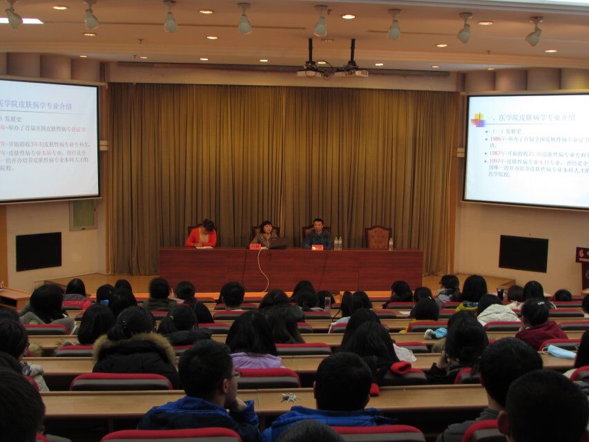 校医学院皮肤与性病专业拥有较悠久的历史,在江苏省也有一定的知名度。高慧书记从我院基本情况着手,分别介绍了该门课程的课程设置、教学和组织形式、社会认知度,从实例中分析了辅修这门课程的优势。告诉我们该课程还特别设置了实验课程:皮肤性病学实验。由于该专业较小,过去不被认知,现在有了一定的发展,所以就业前景良好。