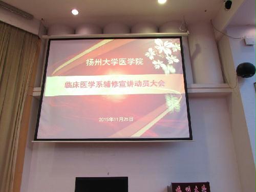 为了进一步明确临床、护理学生未来的学习和就业方向,医学院11月25日晚六点于荷花池校区逸夫图书馆一楼报告厅举办临床医学系、护理学系辅修宣讲动员大会。本次大会邀请了临床医学系书记高慧、系主任孔祥以及苏北医院麻醉科主任纪维等专科教师前来指导,会议由院团委副书记许金鑫老师主持,同时与会的还有辅导员毛蒋楠老师。