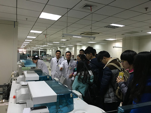 任主任首先介绍了检验科的基本情况,并带领学生们走进实验室,实地参观了一流的现代化的大型检验设备,如罗氏全自动生化分析仪、 IQ200及Aution max AX-4280全自动尿沉渣分析系统、实时荧光定量PCR测定仪、博奥芯片扫描仪、西门子全自动药物检测仪、蛋白全自动血流变仪、全自动过敏源检测系统、博辉微量元素检测系统、糖化血红蛋白分析仪、Sysmex 全自动血细胞流水线、PHOENIX细菌鉴定仪、BACTEC 9120全自动血液培养仪及梅里埃细菌培养和鉴定系统等。