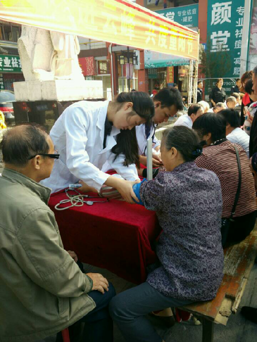 活动伊始,便有不少的居民来到现场,现场十分热闹。来自妇科,内分泌科,中医科,神经科,皮肤科,泌尿科等专家老同志亲切地和居民交谈,为他们解决有关身体各方面的问题。留学生和微疗的成员也井井有条的为居民们量血压并向他们发放健康讲解资料传单。期间,一位老师带着学生去了一位退休扬州解放前抗战人员家里随访,在那里进行了血压测量以及糖尿病咨询。活动最后,大家一起拍照留念。活动圆满成功。