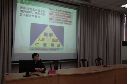 首先,郑院长通过“医学是什么”这样的问题,引出对“医学人文”这一概念的诠释。郑院长认为,医学,不仅需要医道的支撑,更需要人文的辅助。接着,郑院长向大家介绍了暑期医学院师生赴台湾交流学习的经历。此次医学院师生到台湾花莲慈济医院进行了为期两周的交流和学习,慈济医院在人文方面的特色工作让赴台师生印象深刻。以人本医疗,尊重生命为理念的台湾慈济医院能使学生们能更好的体会了解到医学人文的深厚内涵,这也是此行大家最大的收获。