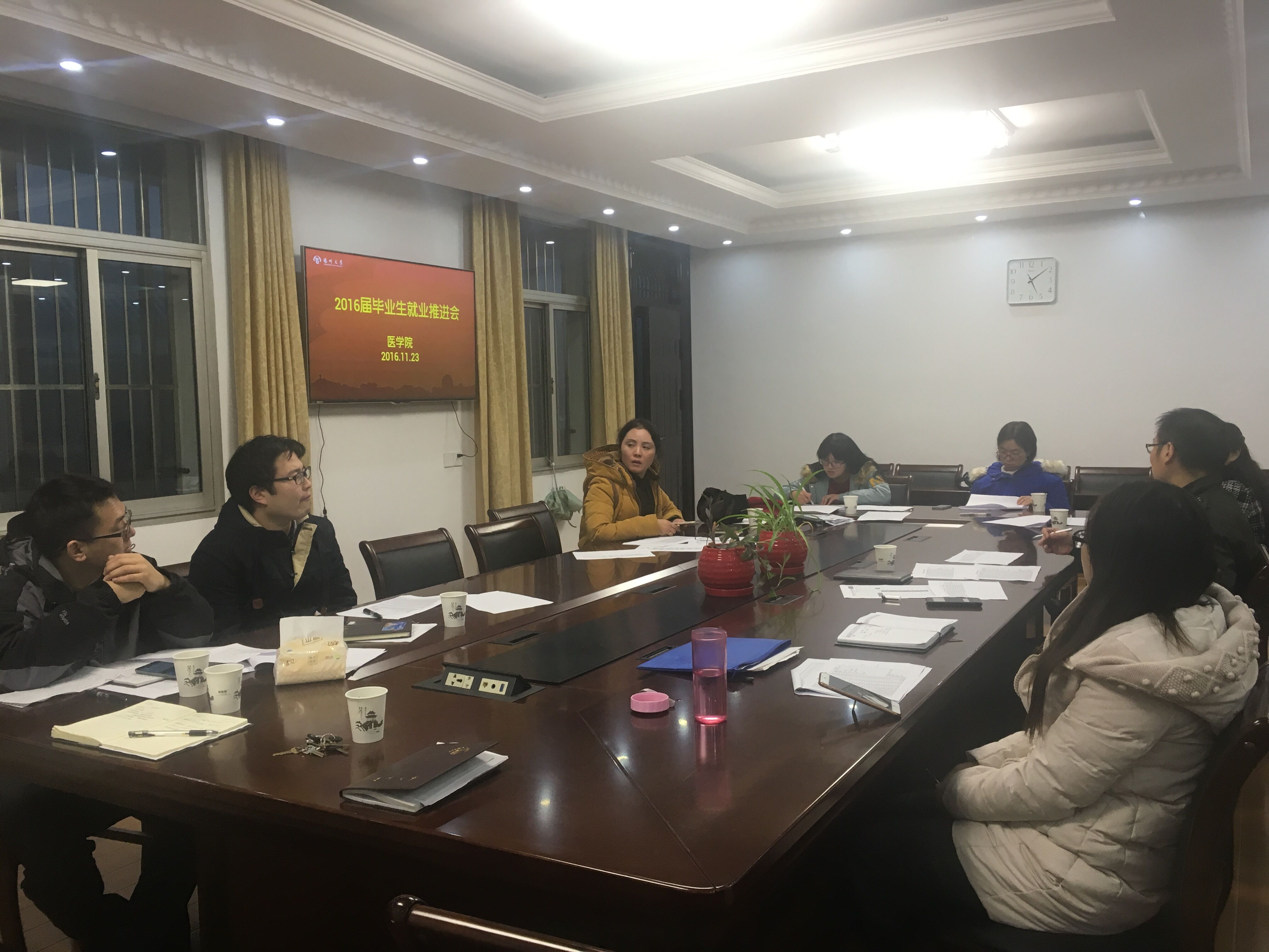 2016年11月23日下午,医学院在院四楼会议室举行2016届毕业生就业推进会,会议由院党委副书记陈轶群老师主持,团委学工办、2016届本科生和研究生班主任老师参加。