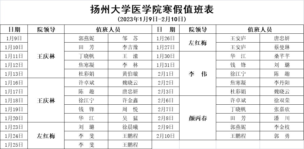 扬州大学医学院2023寒假值班表