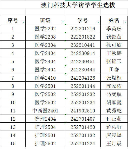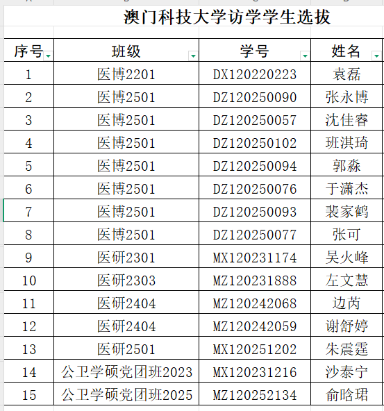 根据学部部署和文件精神,在学生个人自愿报名的基础上,经学部初审、面试,现将拟选派赴澳门科技大学访学学生名单公示如下: